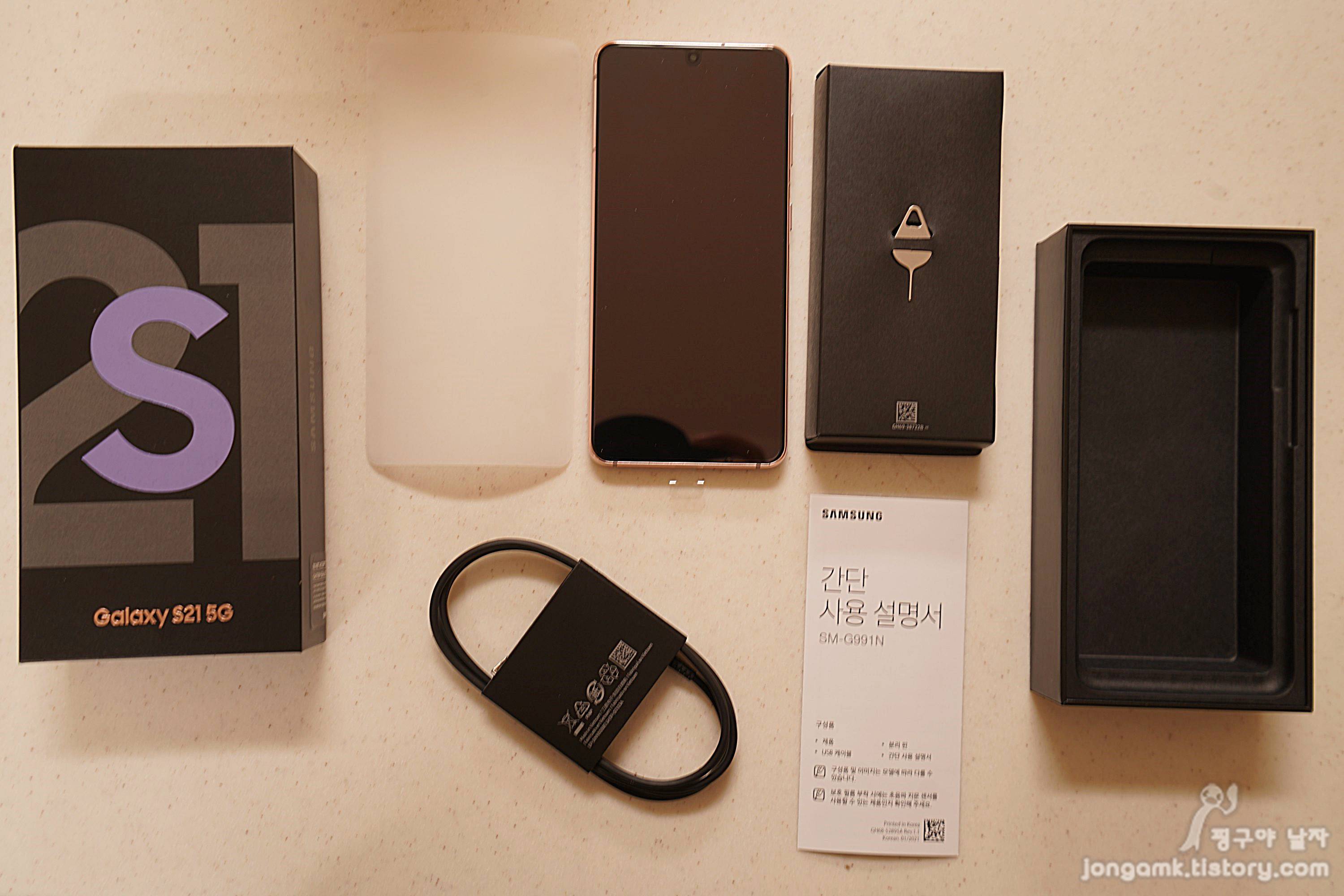 갤럭시S21의 구성품은 스마트폰, 간단 사용설명서 그리고 충전케이블ㅡ 유심핀 등입니다. 이어폰은 그렇다고 치고 총전 어댑터도 없네요. 직장에서도 사용하려는 분들은 좀 아쉽겠죠. 개인적으로는 무선충전기를 사용하고 있어요.