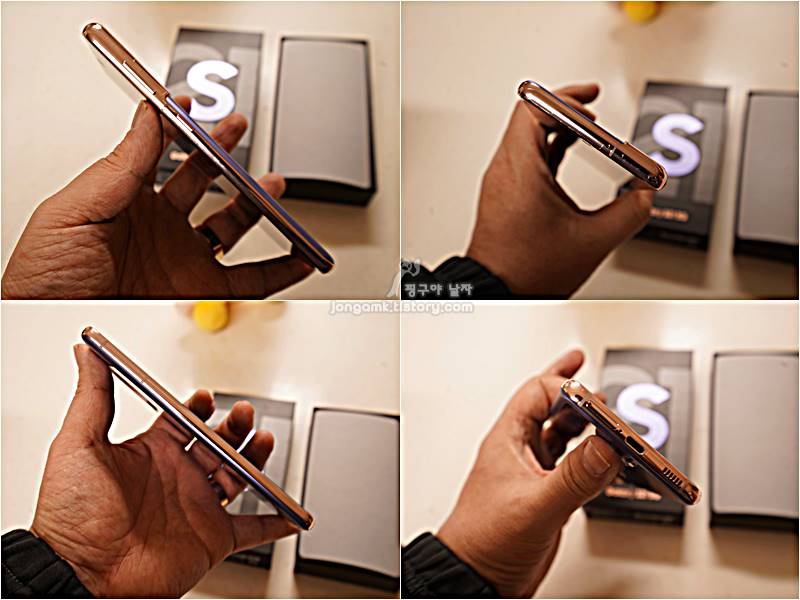 갤럭시S21의 모습입니다. 아이폰12의 각진 디자인과 비교하게 되다보니 오히려 갤럭시S21의 디자인이 좀 올드해 보이기도 했어요.
