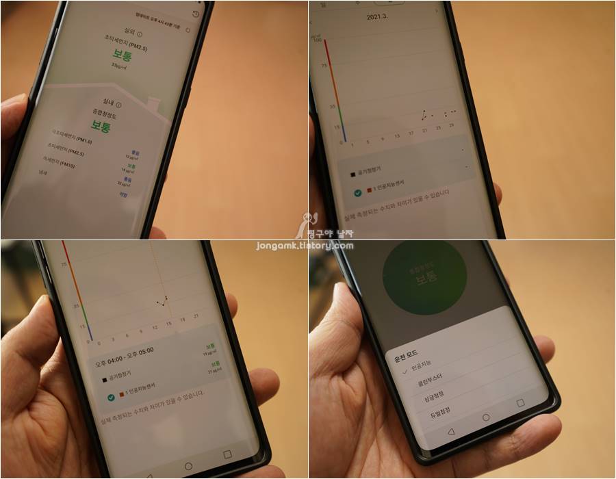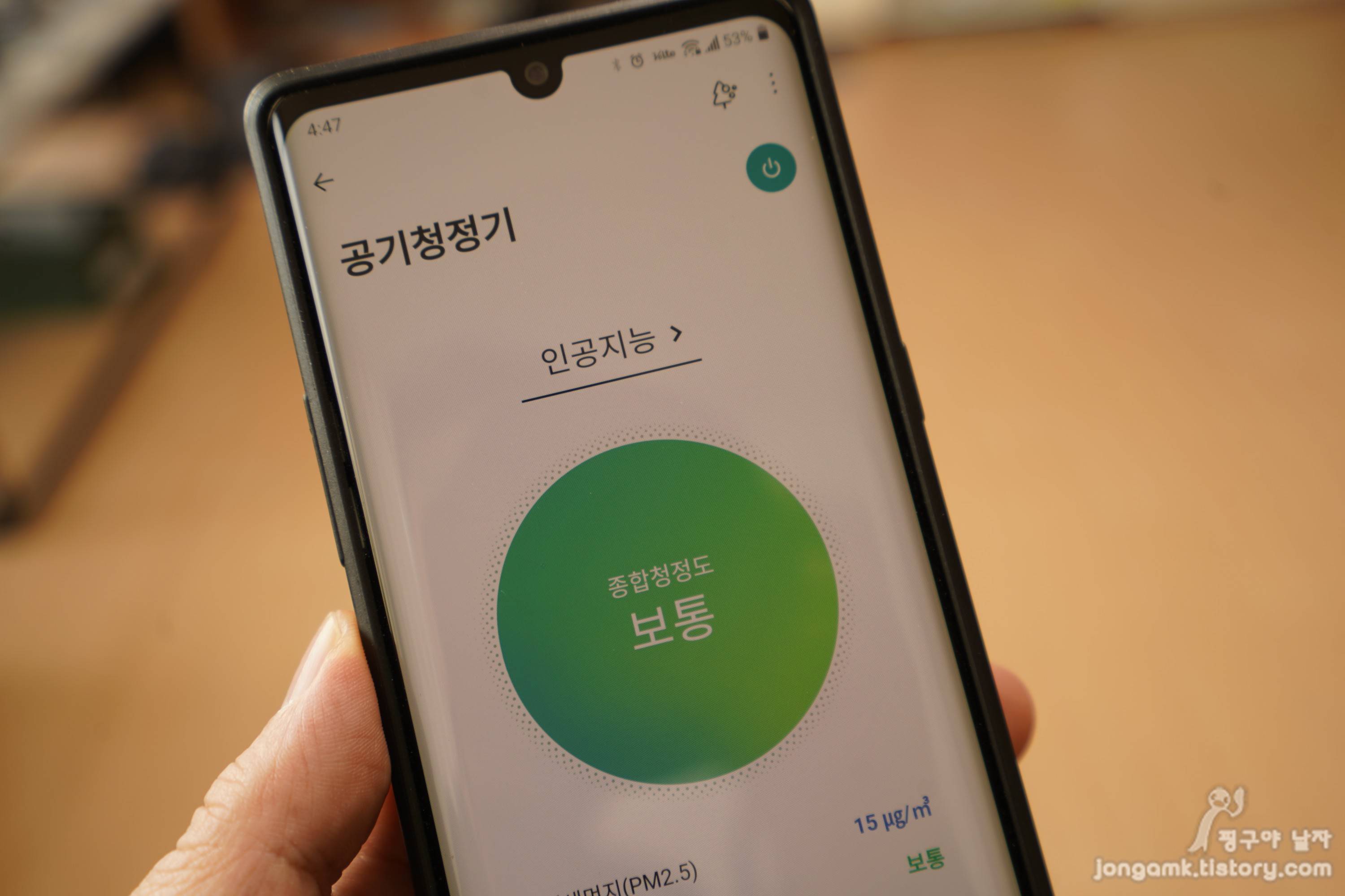 가끔 바깥 공기가 너무 좋지 않으면 미리 스마트폰으로 인공지능센서를 탑재한 LG 퓨리케어 360도 공기청정기 알파를 작동시키고 실내 공기 상태를 바로 확인할 수 있고 결과에 따라 Off시킬 수 있어요.