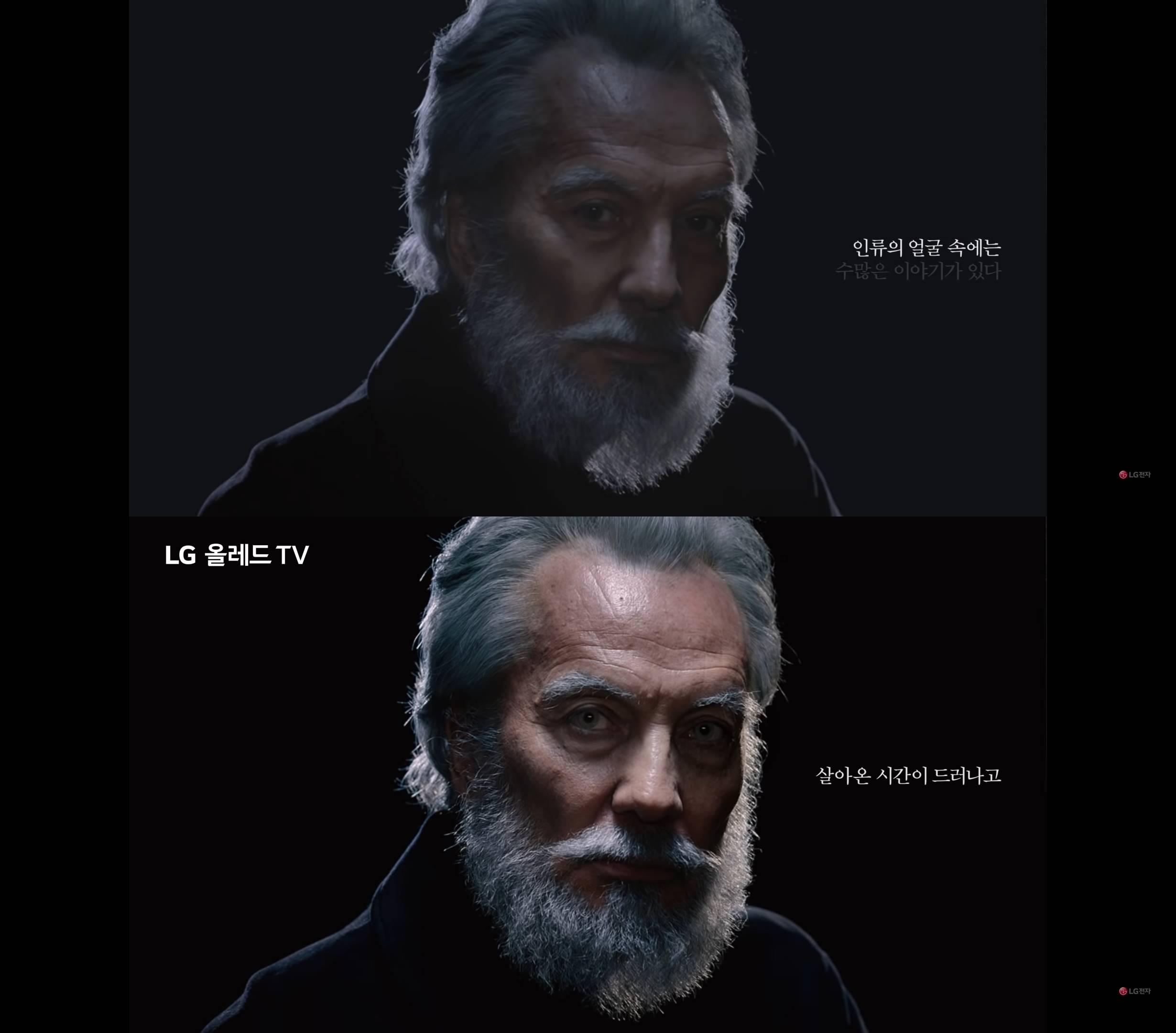 LG 올레드TV CF의 주제를 「Humanity」로 선택한 이유는 뭘까요? 사람의 얼굴은 그 사람이 살아온 인생을 고스란히 보여 준다고 생각합니다. 인류의 얼굴에 담긴 수많은 이야기를 완벽한 블랙과 높은 명암비 그리고 우수한 색재현율로 있는 그대로 전달할 수 있다는 자신이 있기 때문 아니었을까요.