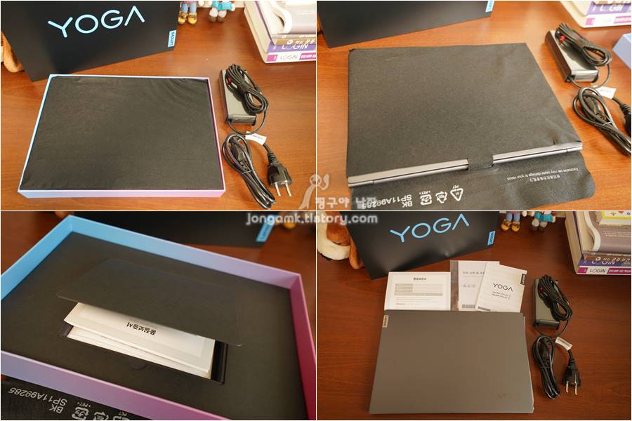 요가 슬림 7 프로를 개봉하지 노트북이 융으로 잘 싸여져 있었고 바로 아래에는 제품 보중서 등등이 있었습니다. 그리고 직사각형의 박스에는 충전기 세트가 들어 있었습니다.