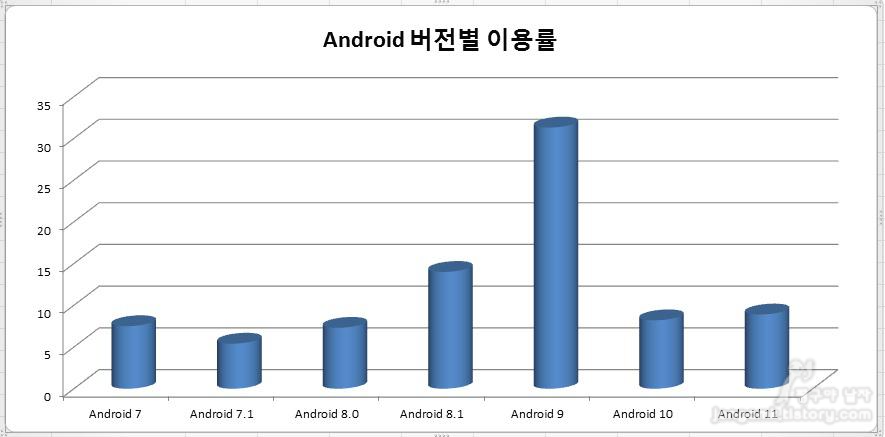참고로 안드로이드OS는 Android11까지 업데이트 되었는데 안드로이드 버전별 이용율을 보면 Android9의 이용률이 다른 버전과 비교될 정도로 높은 것을 알수 있습니다.