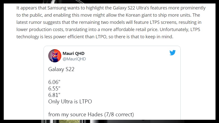 갤럭시S22는 6.06인치, 갤럭시S22 플러스는 6.55인치 그리고 갤럭시S22 울트라는 6.81인치로 예상하고 있습니다. 갤럭시S21과 작게는 0.19인치 크게는 0.15인치 차이라 작아졌다는 느낌 정도~