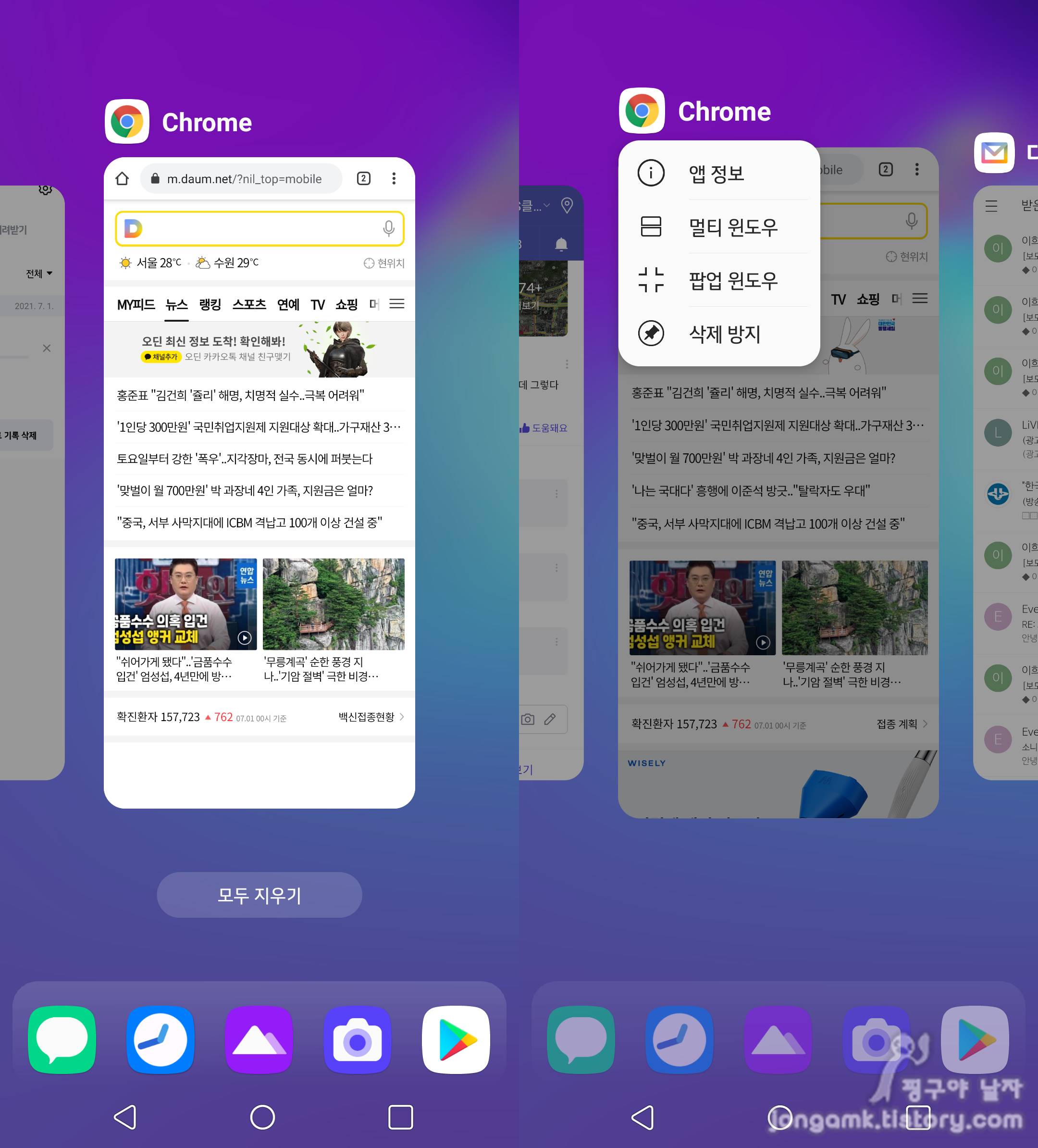 메뉴버튼을 누르면 스마트폰 화면에 사용했던 앱들이 나타나는데요 예를 들면 포털 다음(DAUM)을 선택하고 다음 아이콘을 한번더 누르면 멀티윈도우 또는 화면분할 메뉴가 보입니다.