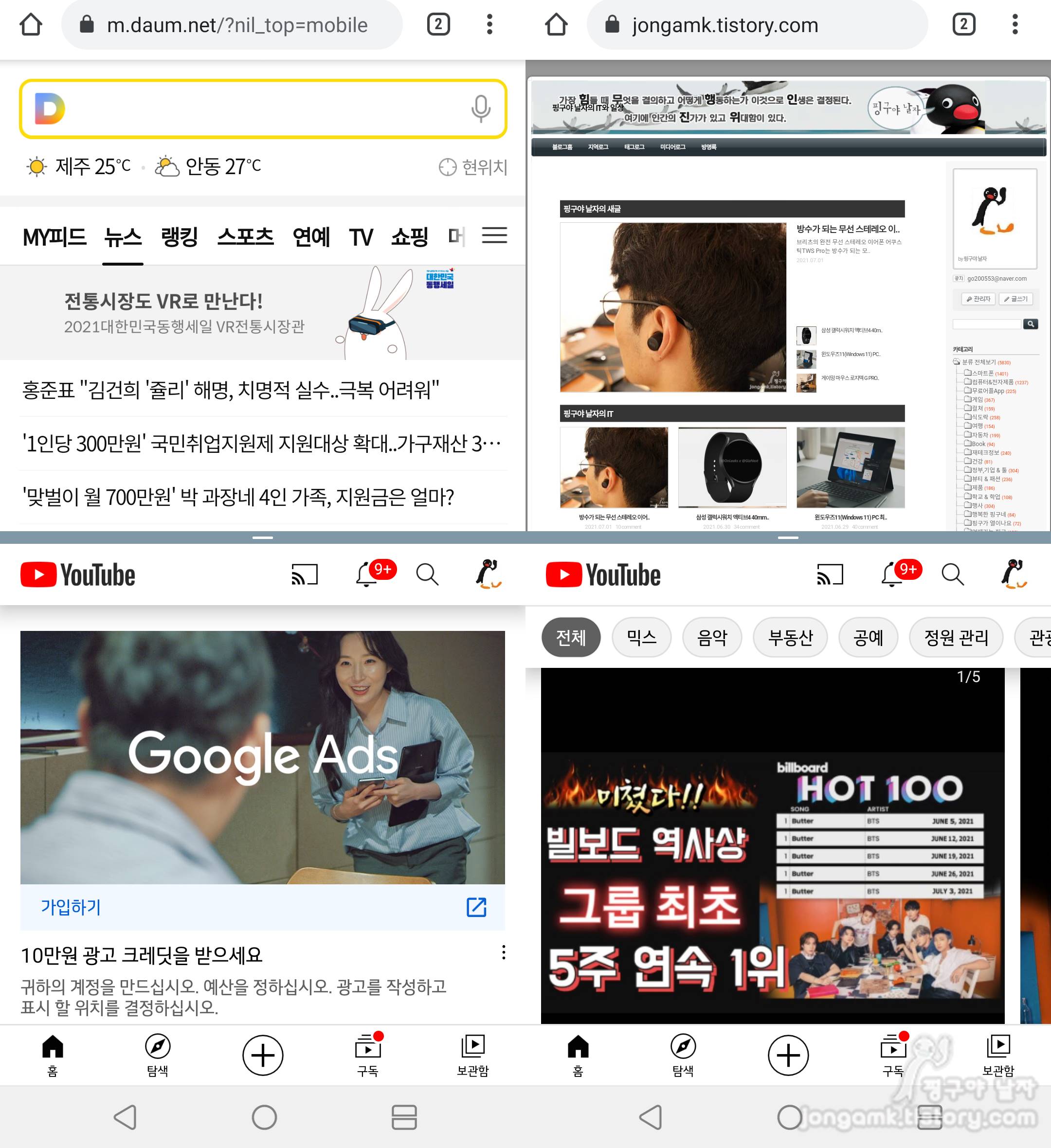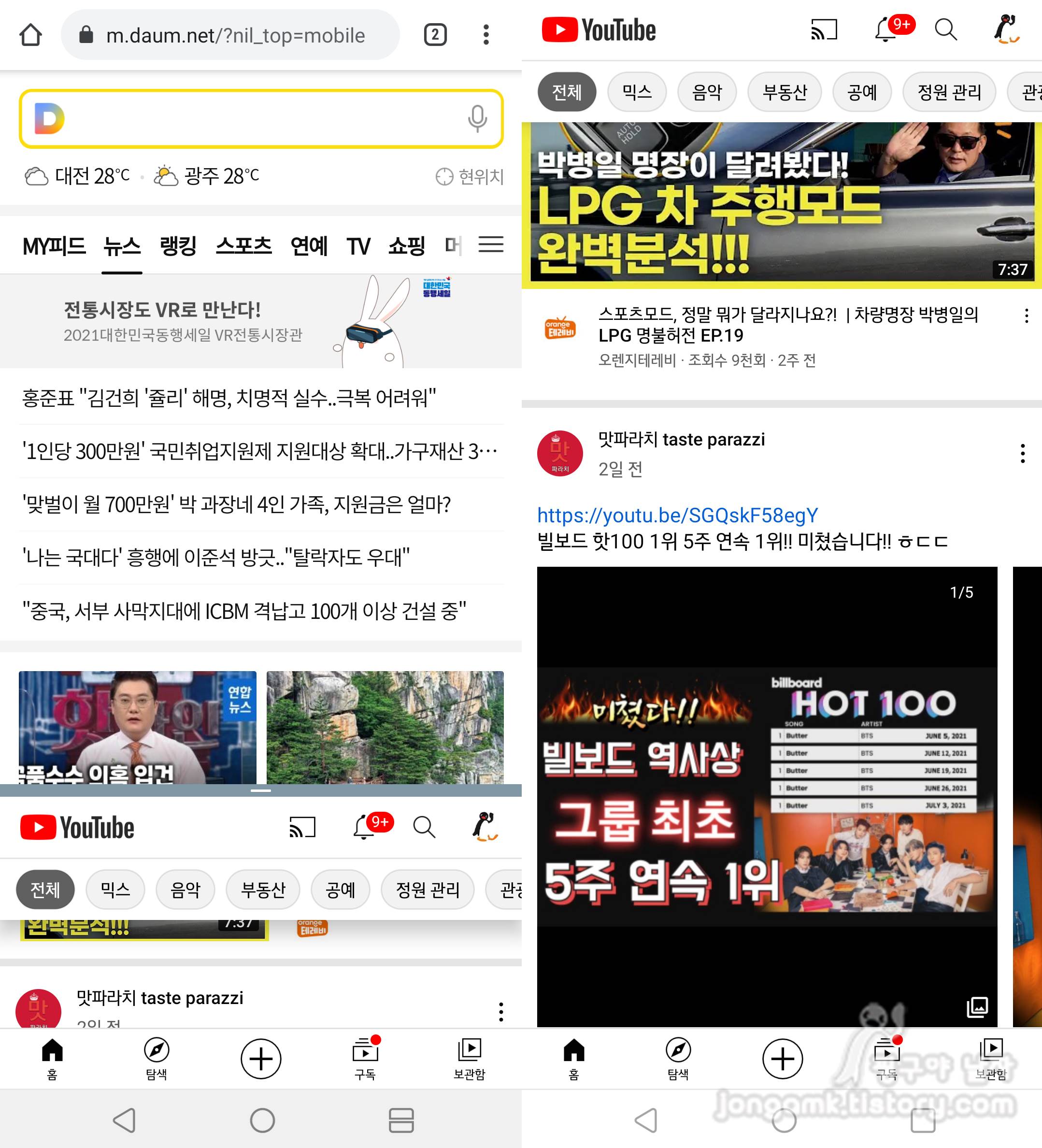 앱에 따라서는 멀티윈도우(화면분할)로 사용할 수 없을 수도 있고 유튜브처럼 앱으로는 안되지만 브라우저로 유튜브를 구동시키면 멀티윈도우(화면분할)를 사용할 수 있기도 합니다.