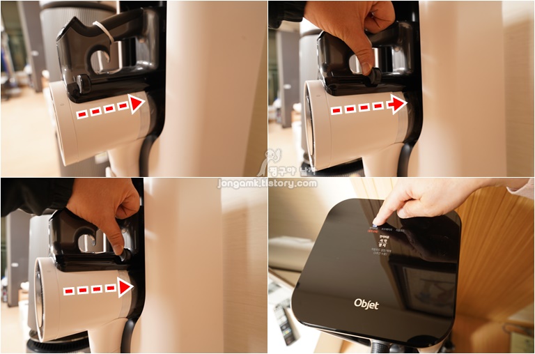 먼지비움모드를 사용해도 되지만 자동으로 설정해두면 매번 버튼을 누르지 않아도 청소기를 거치할 때마다 알아서 먼지통을 비워 너무 편하답니다. 무선청소기의 레버를 안쪽으로 몇 차례 밀어주면 좀 더 빠르고 깔끔하게 정리할 수 있어요.
