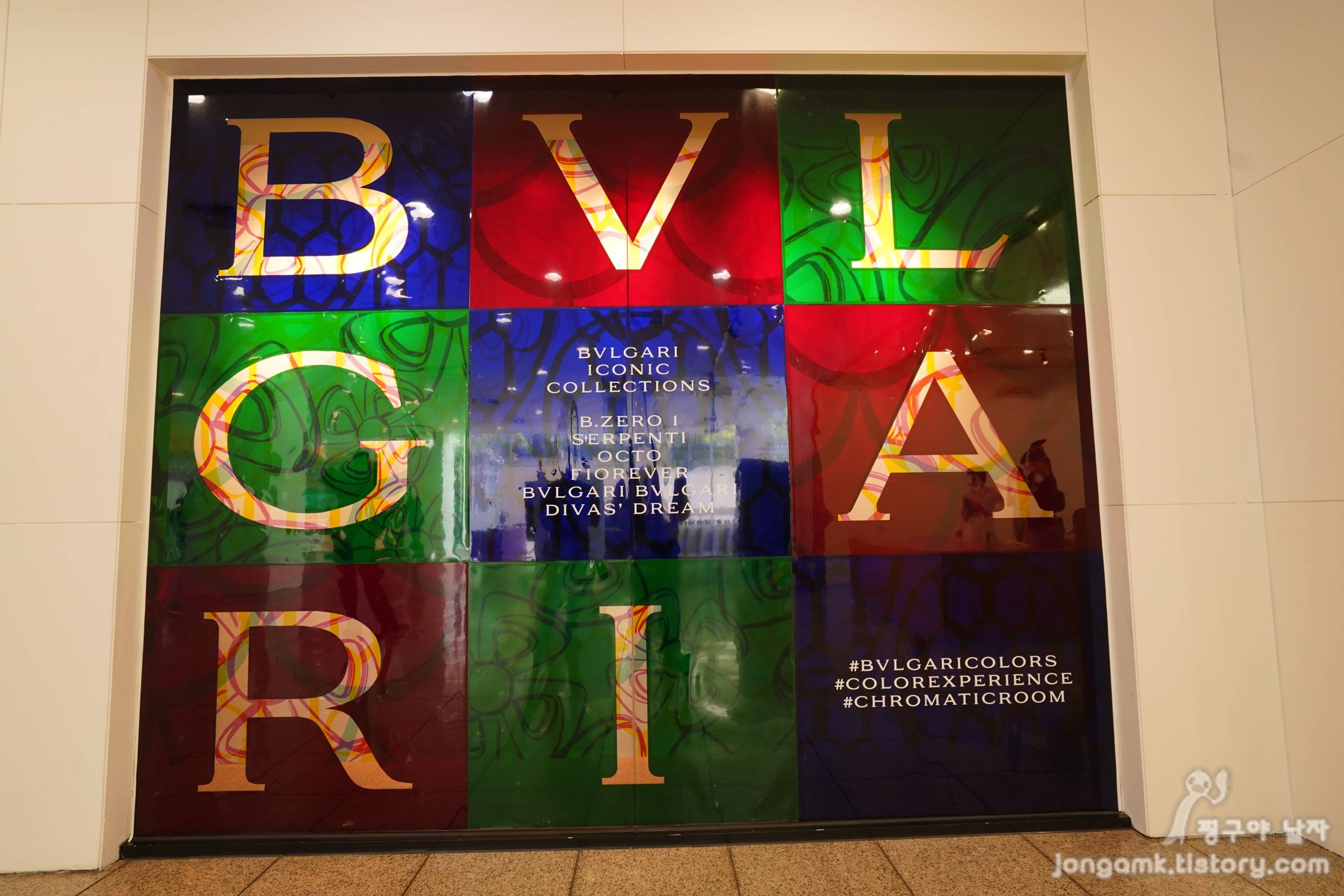 멀티컬러가 선사하는 즐거움을 마음껏 느낄 수 있는 공간에 도착하면 누구라도 배경으로 추억을 남기도 싶어 할 겁니다. 불가리가 주는 보석 컬러의 매력을 충분히 느껴볼 수 있어 인기가 많은 공간이 될 듯합니다.