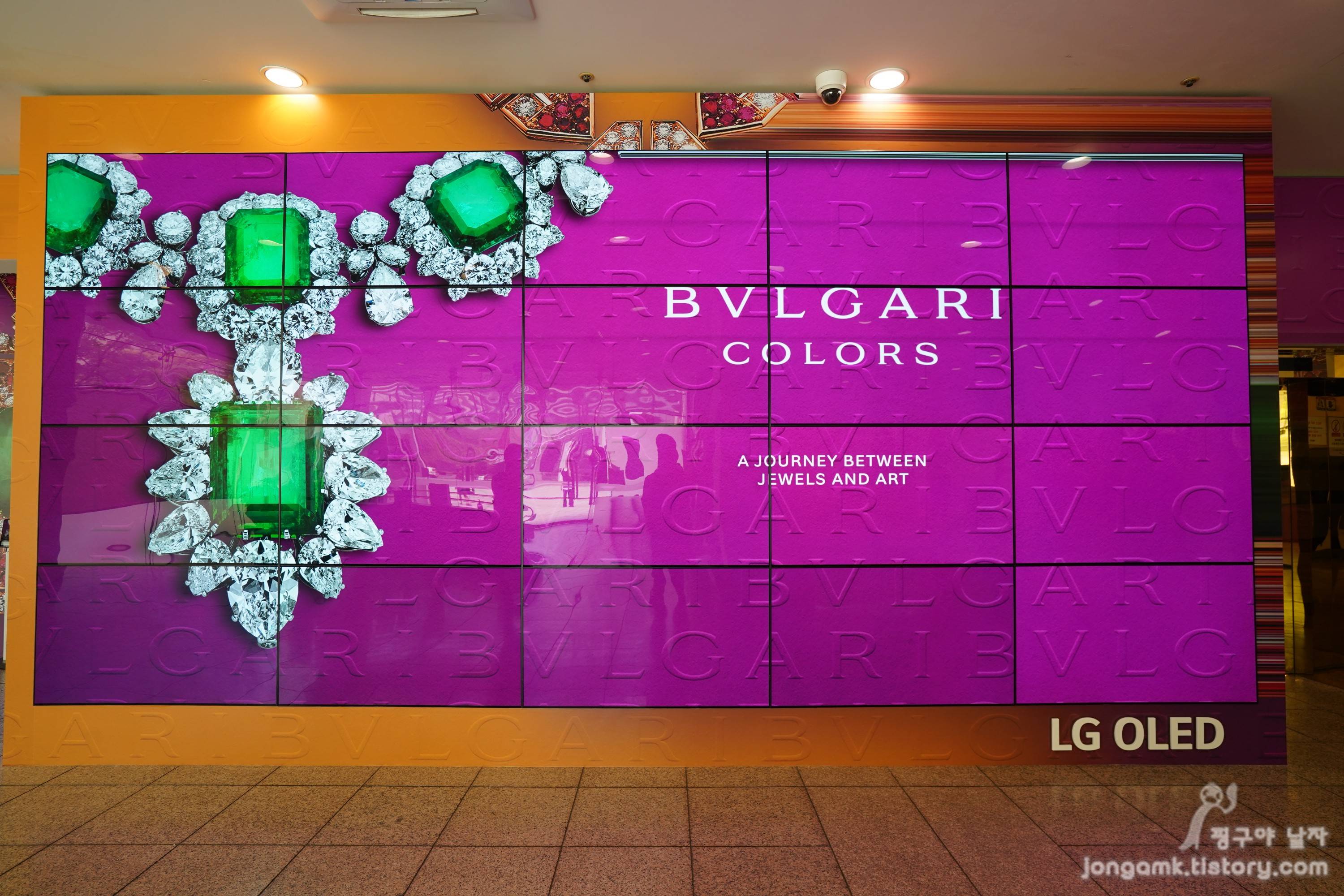 예술의 전당 한가람디자인미술관 로비에 들어서자 올레드 사이니지 20대를 붙여 만든 대형 비디오월이 눈에 들어왔습니다. 불가리 컬러 전시회를 생생한 화질로 잘 표현해 기념사진도 찰칵~ 보석과 올레드의 콜라보 은근 기대되는 거 있죠.