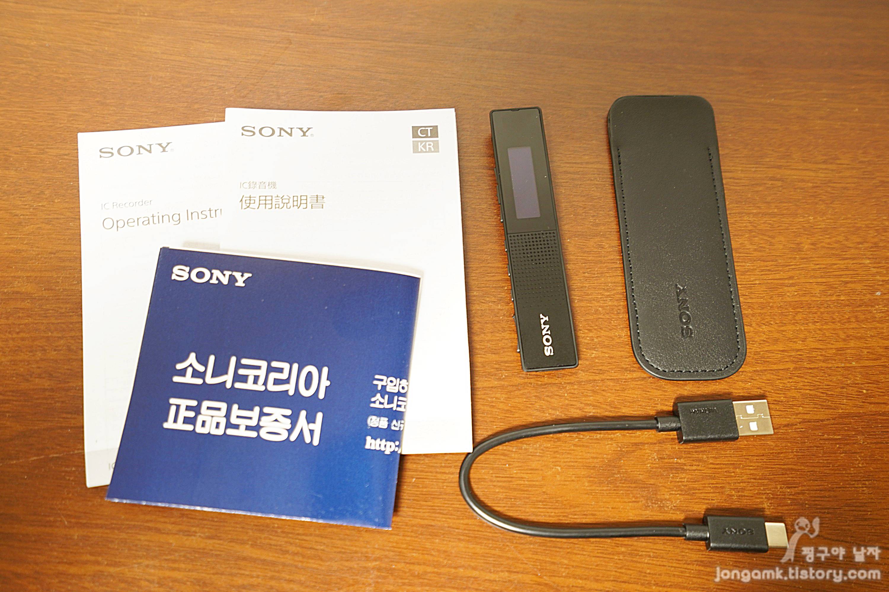 보이스 레코더 ICD-TX660의 구성품은 보이스 레코더, USB Type-C 충전케이블, 가죽 파우치 그리고 정품보증서와 사용설명서로 되어 있습니다.