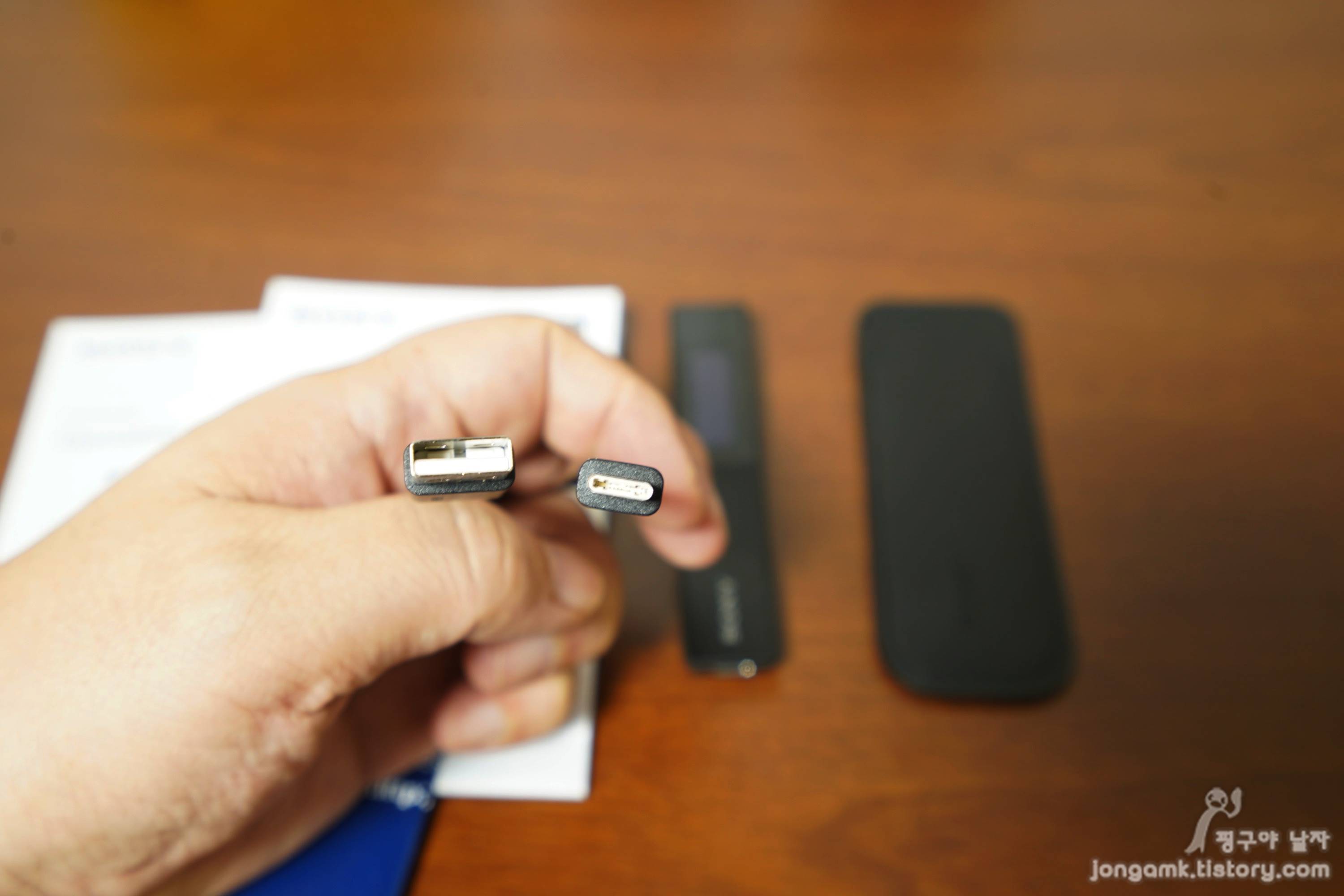 이어폰을 연결해 녹음파일을 재생하여 들을 수 있고 반대편에는 USB Type C 충전포트가 보입니다. 그리고 가죽 파우치에 넣어 보관할 수도 있습니다. 장거리 여행시 안전하게 보관할 수 있겠죠.