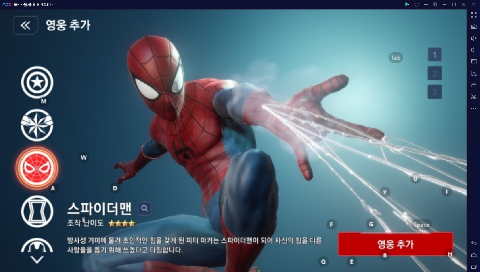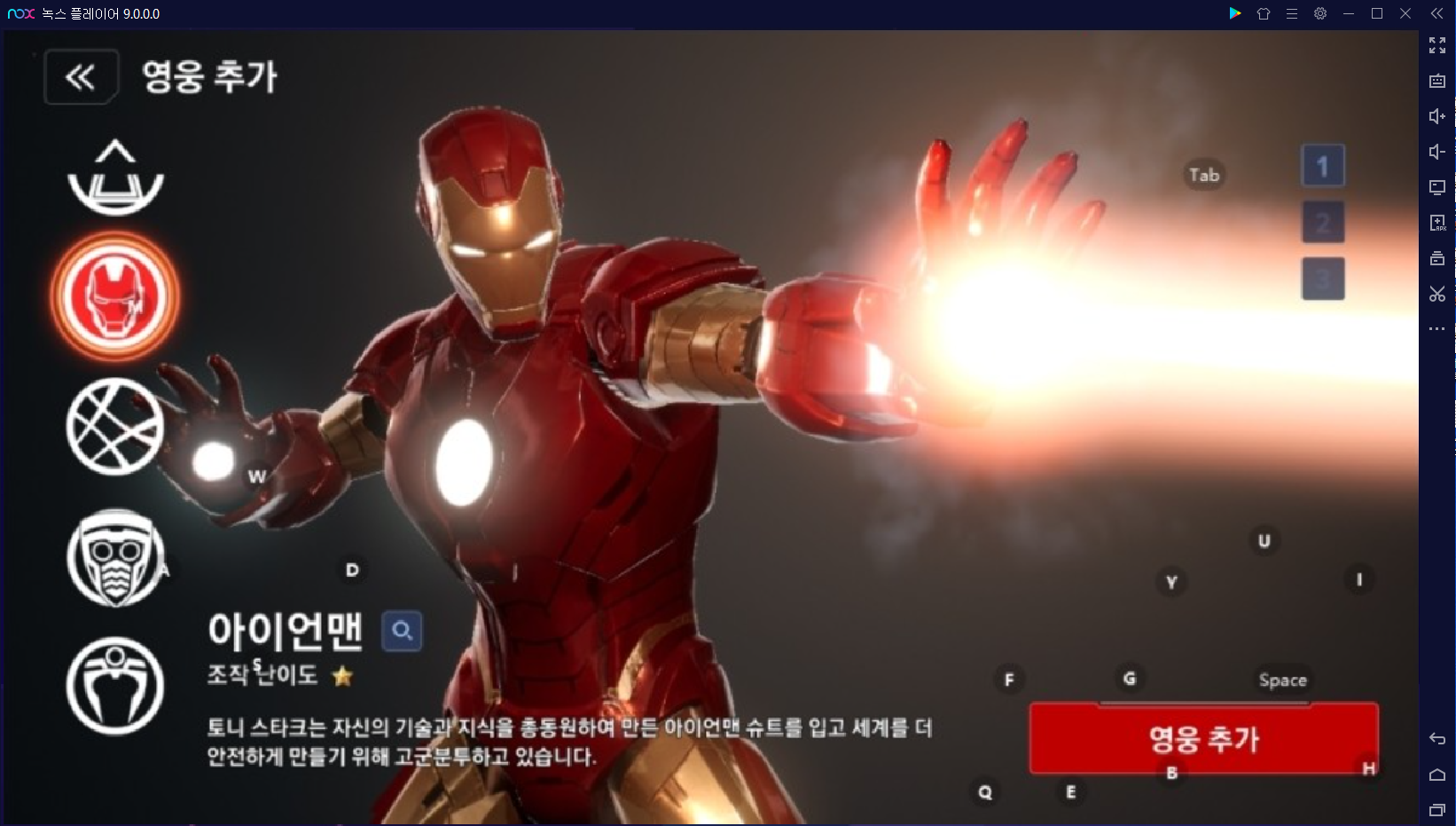 일단 개인적으로 좋아하는 아이언맨은 조작난이도가 화면에 보이는 대로 별 하나입니다. 근거리보다는 원거리에 적합한 영웅으로 영화에서 활약했던 대로 슈트의 종류에 따라서 스킬의 차이가 있습니다. 원거리 공격으로 다른 캐릭터에 비해 안정적이죠.