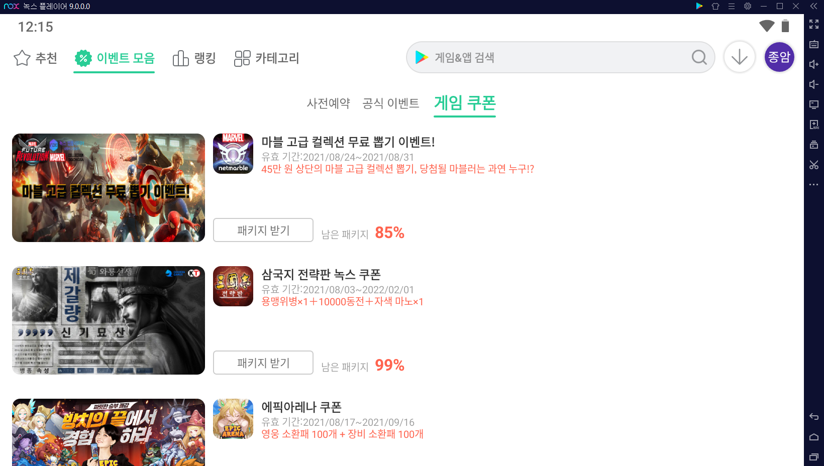 그래서 '패키지 받기' 를 눌렀어요. 바로 결과가 나왔는데 아쉽게도 다음 기회에 ㅋㅋ 녹스 앱플레이어 덕분에 PC 대화면으로 마퓨레를 공략하는 것도 좋았고 녹스만의 꿀 이벤트도 참여할 수 있어 더 좋았어요.