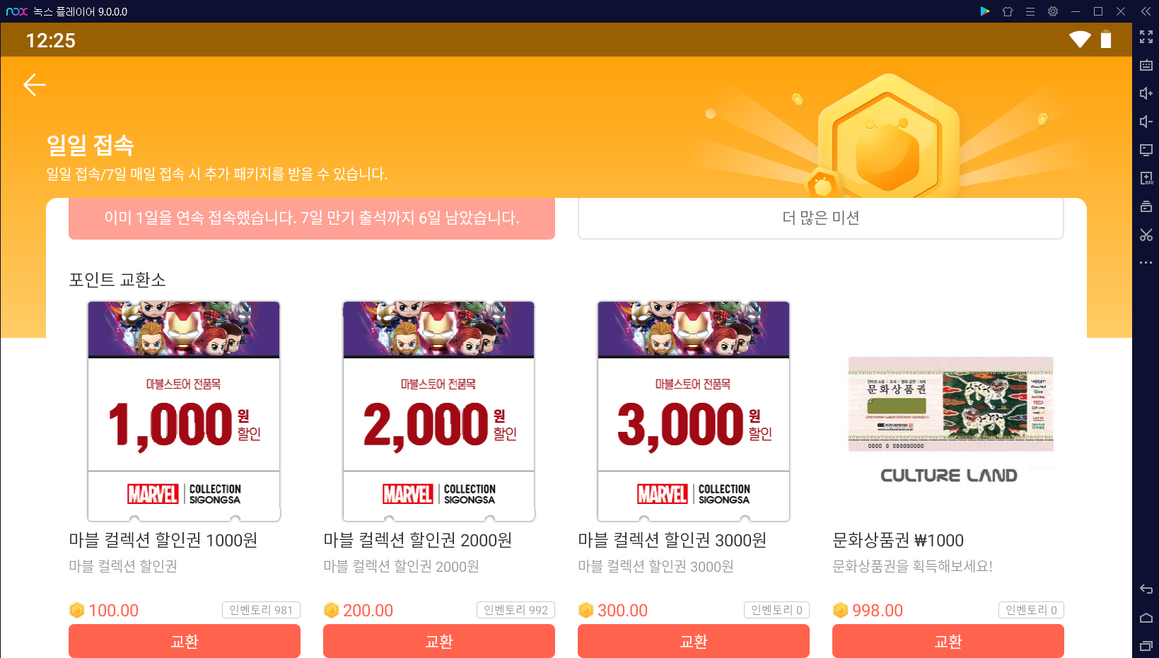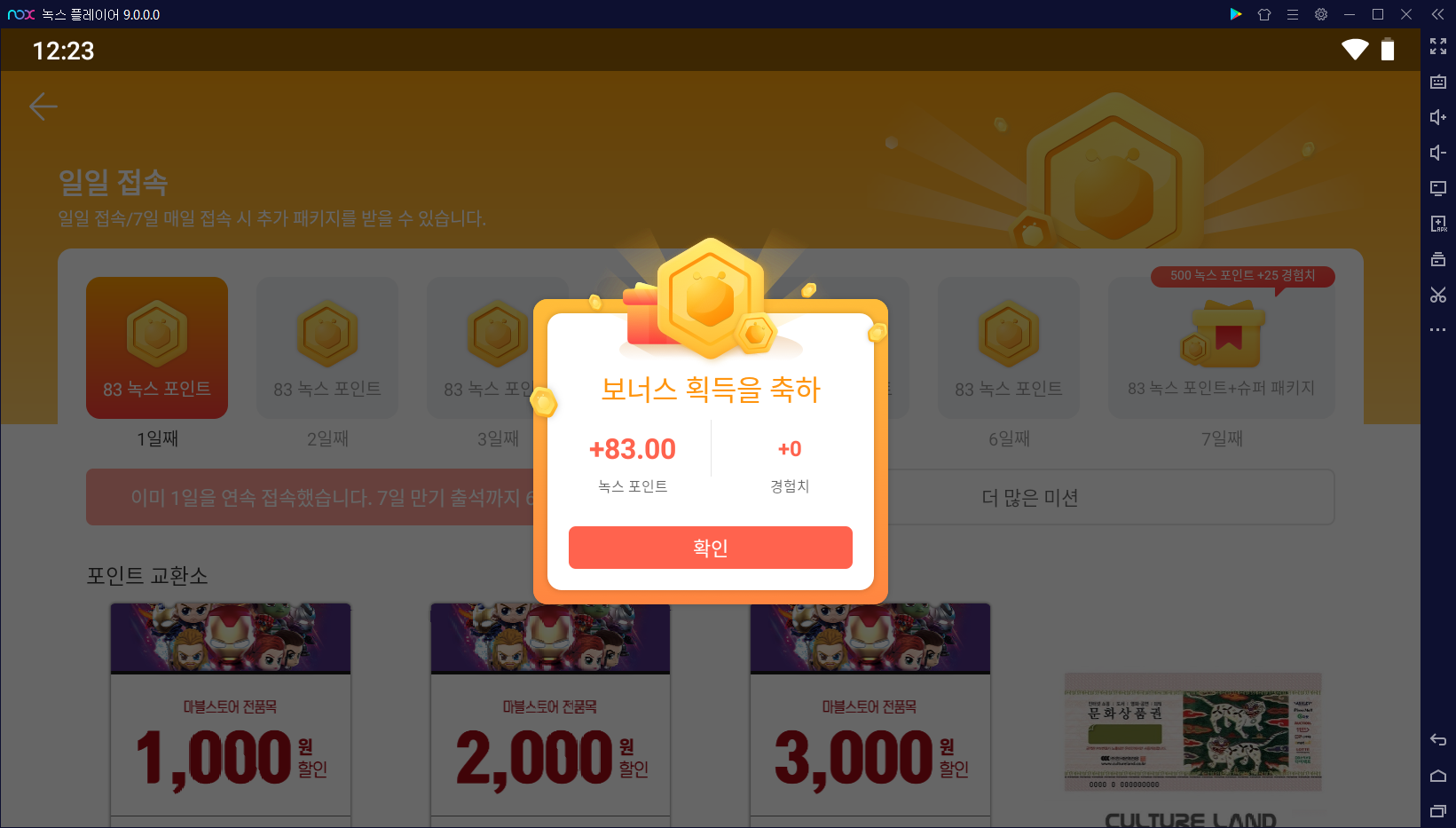 녹스 앱플레이어에 한번 출첵을 할 때마다 83 녹스포인트를 받을 수 있으니 7일이면 581 녹스포인트를 받을 수 있네요. 그리고 마지막 7일재는 수퍼패키지까지~~