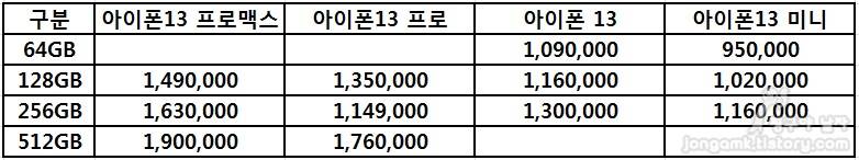 아이폰13 시리즈의 출고가는 아이폰13 미니(64GB) 950,000원 ~ 아이폰13 프로맥스(512GB) 1,900,000원으로 약간의 차이는 있을 수 있으니 감안하고 준비하면 될 듯합니다.