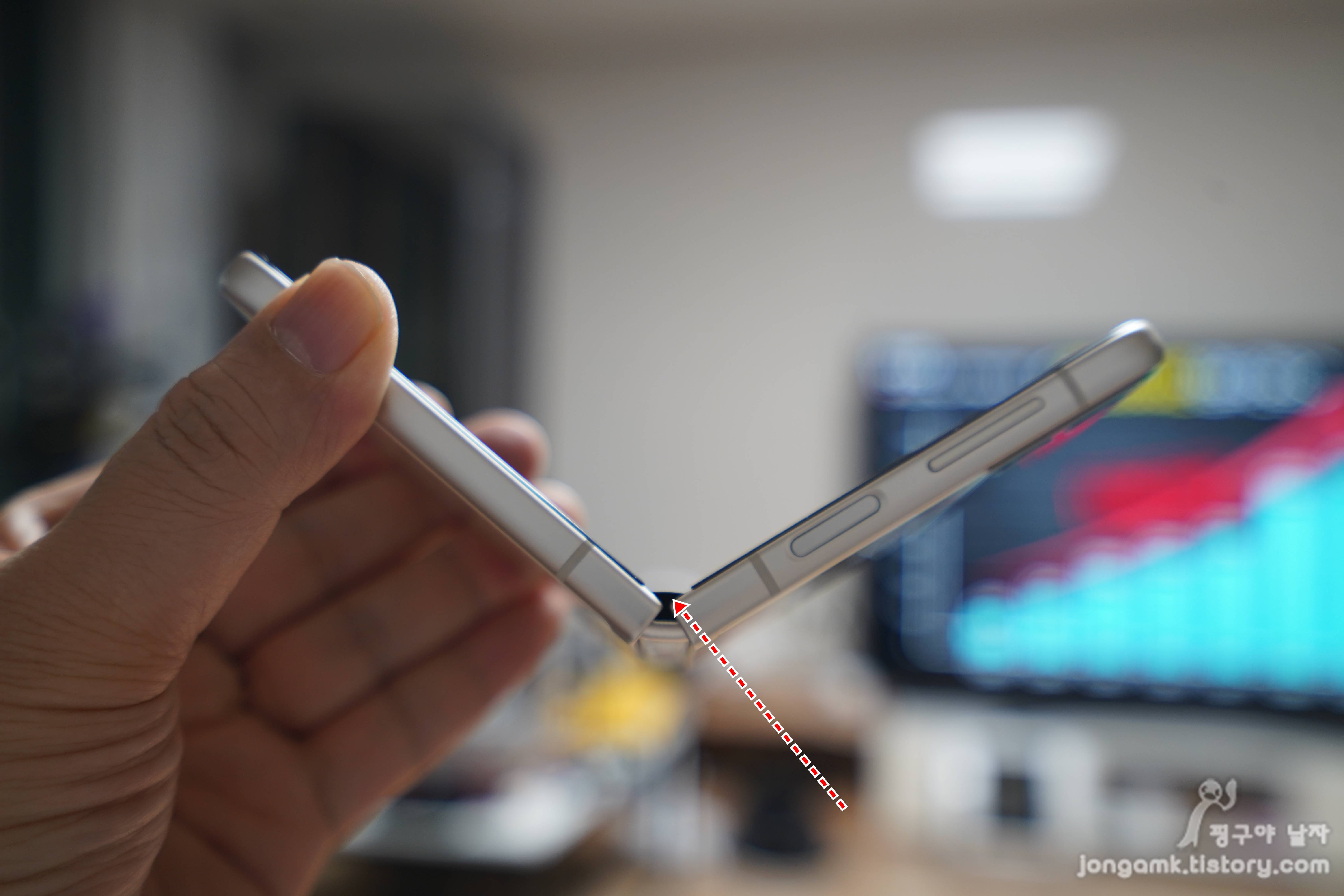 갤럭시Z 플립3의 접히는 부분의 디스플레이의 모습니다. IPX8(1.5m 맑은 물에서 최대 30분)의 방수기능을 제공한다고 해도 사실 걱정을 했거든요. 물론 삼성이 충분한 테스트를 했을테니 기우에 불과하였지만~