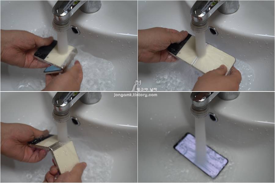 갤럭시Z 플립3의 방수 성능을 확인해 보기로 했습니다. 쫄리는 마음으로 세면대에서 잠시나마 방수테스트를 했는데 이상이 없었습니다. 물론 접히는 부분에 물기가 남아있어 잘 털어 주어야 했습니다.