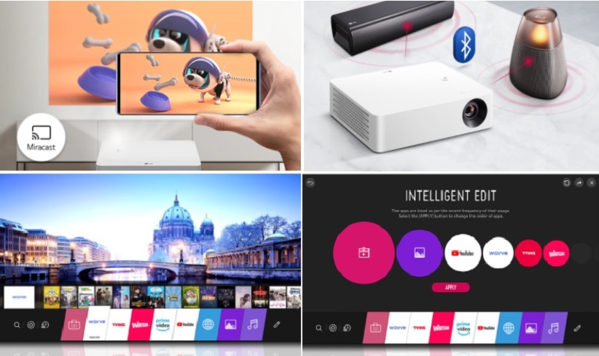 최신 엘지 시네빔(PF610P)은 에어플레이2와 미라캐스트를 지원합니다. 그리고 iOS12 이상, 안드로이드6.0 이상의 스마트폰이면 엘지 시네빔과 쉽게 화면 공유를 할 수 있어요.