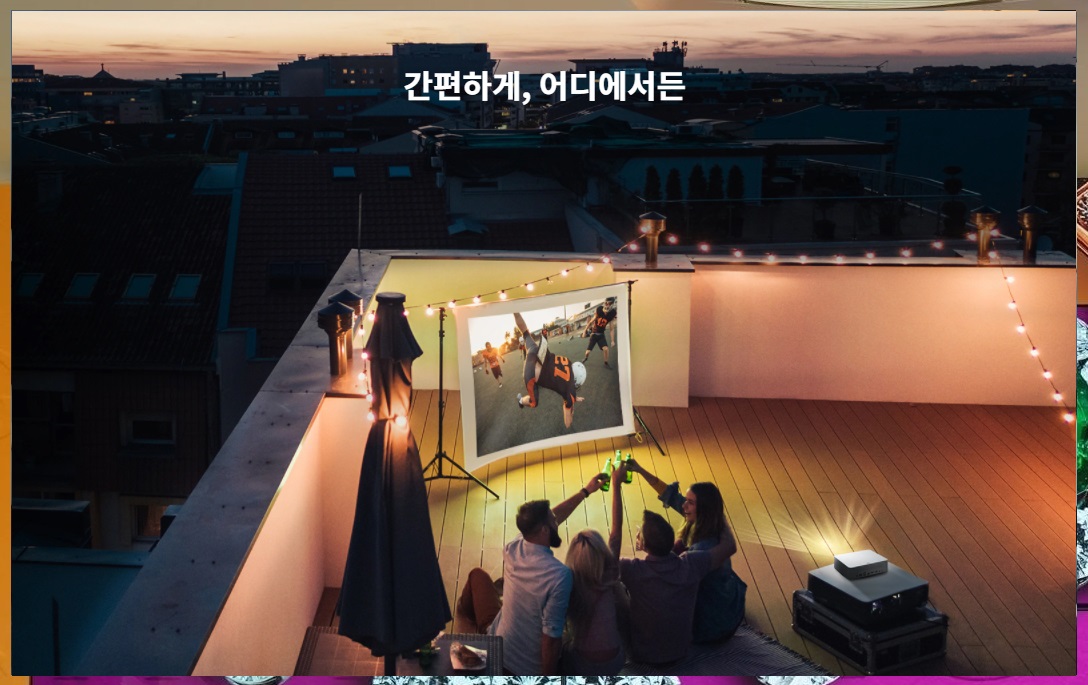 스마트폰에 저장된 추억의 사진을 가족과 함께 120인치 대화면으로 즐길 수 있으니 점수 따는데 문제 없겠죠. 화면 맞춤 기능은 리모컨으로 네 개의 화면 모서리를 조정하면 됩니다. 화면 왜곡을 방지하는 상하자동 화면 맟춤모드와 함께 사용하면 만족도가 더욱 높아지겠죠.