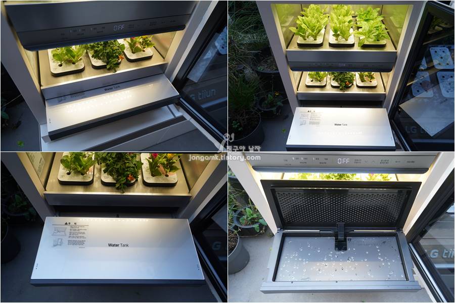 엘지 틔운 내부 하단에 물탱크를 보여 주는데 오호~~물공급 자동화 시스템이 적용되어 물을 일일이 줄 필요 없이 알아서 공급해주니 정말 놀라운 일이죠.