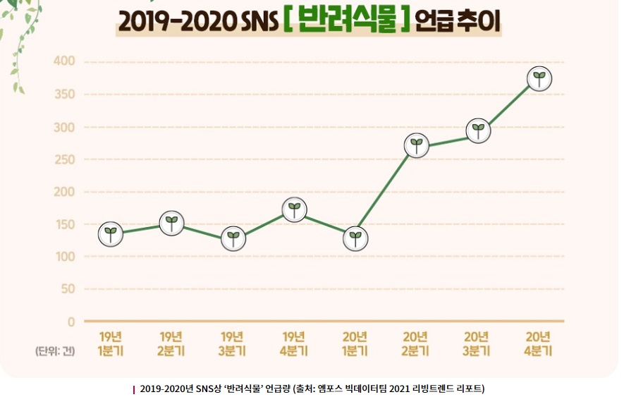 엠포스 빅데이터팀의 2021 리빙 트렌드 리포트에서 2019년부터 2020년 SNS상에서 반려식물의 언급 추세가 플랜테리어에 대한 관심을 증명하고 있습니다.