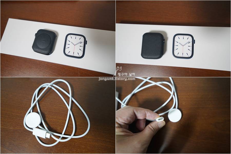 그런데 충전기는 기본 품목에 없었습니다. 아마도 처음 구매한 분이라면 충전을 할 수 없어 순간 당황할 수도 있습니다. 안드로이드 스마트폰을 사용하는 분이라면 있을 수도 있겠지만 애플워치와 궁합이 맞는 충전기를 사용하는 게 고속충전 등을 제대로 사용할 수 있겠죠.