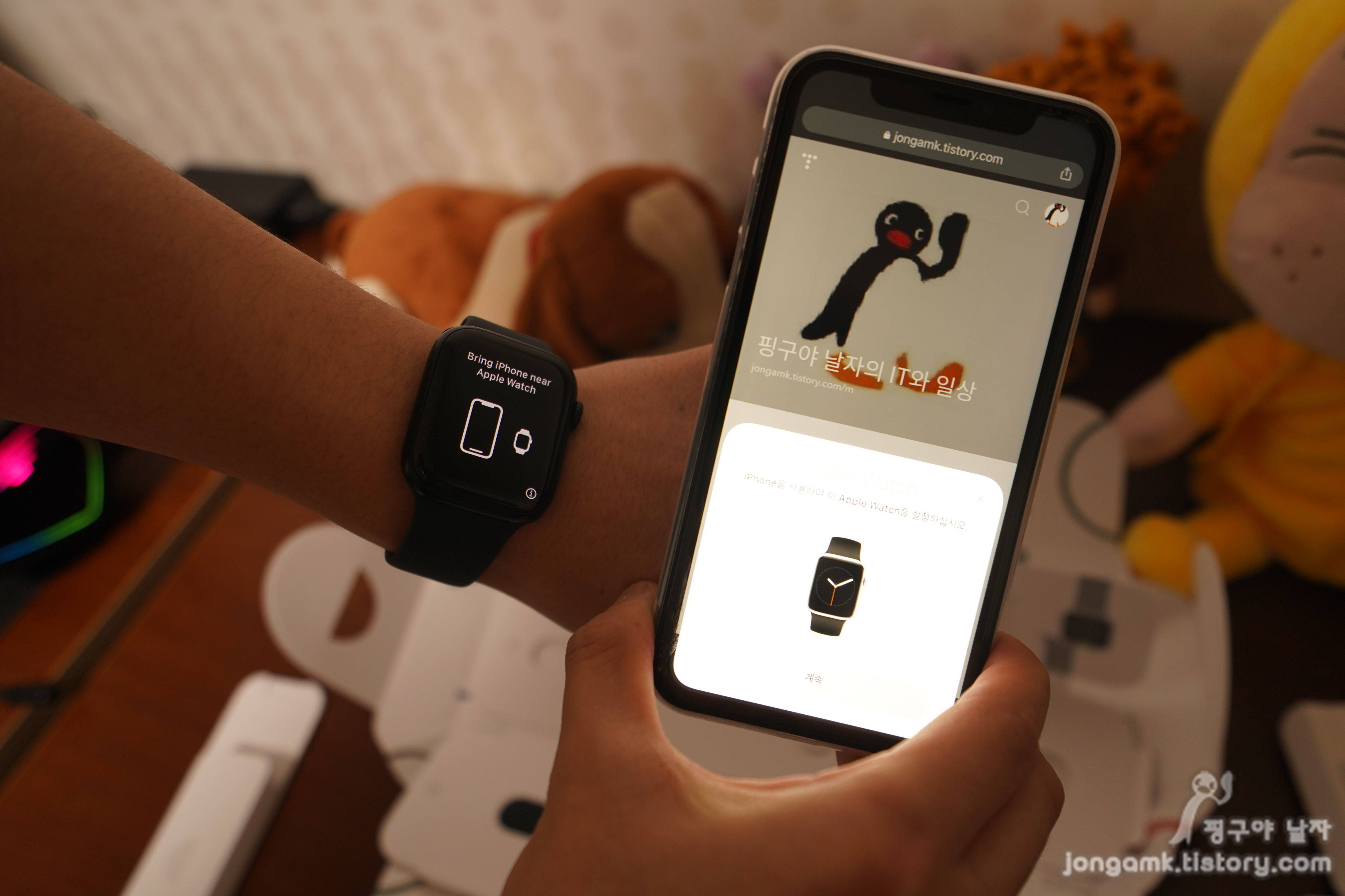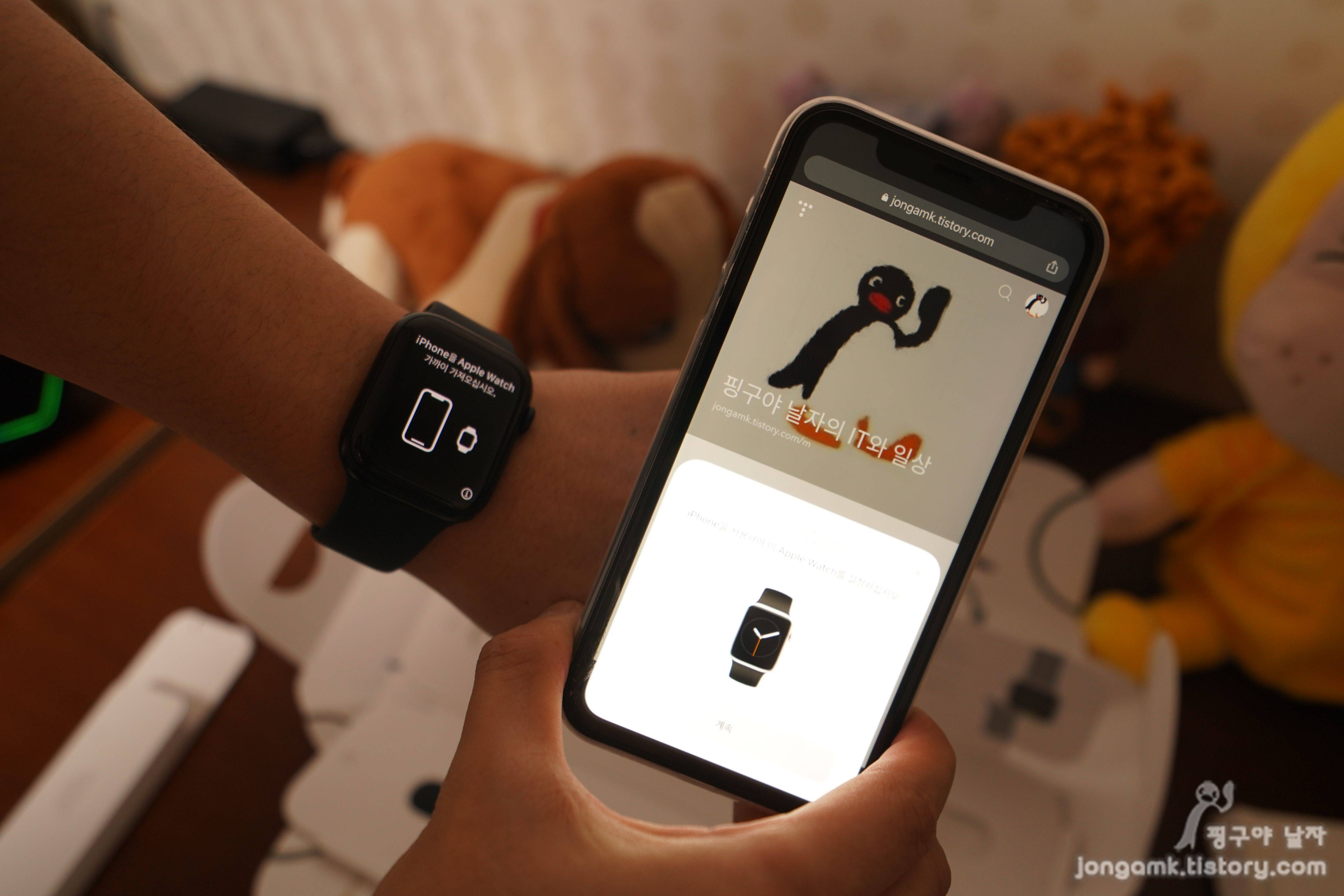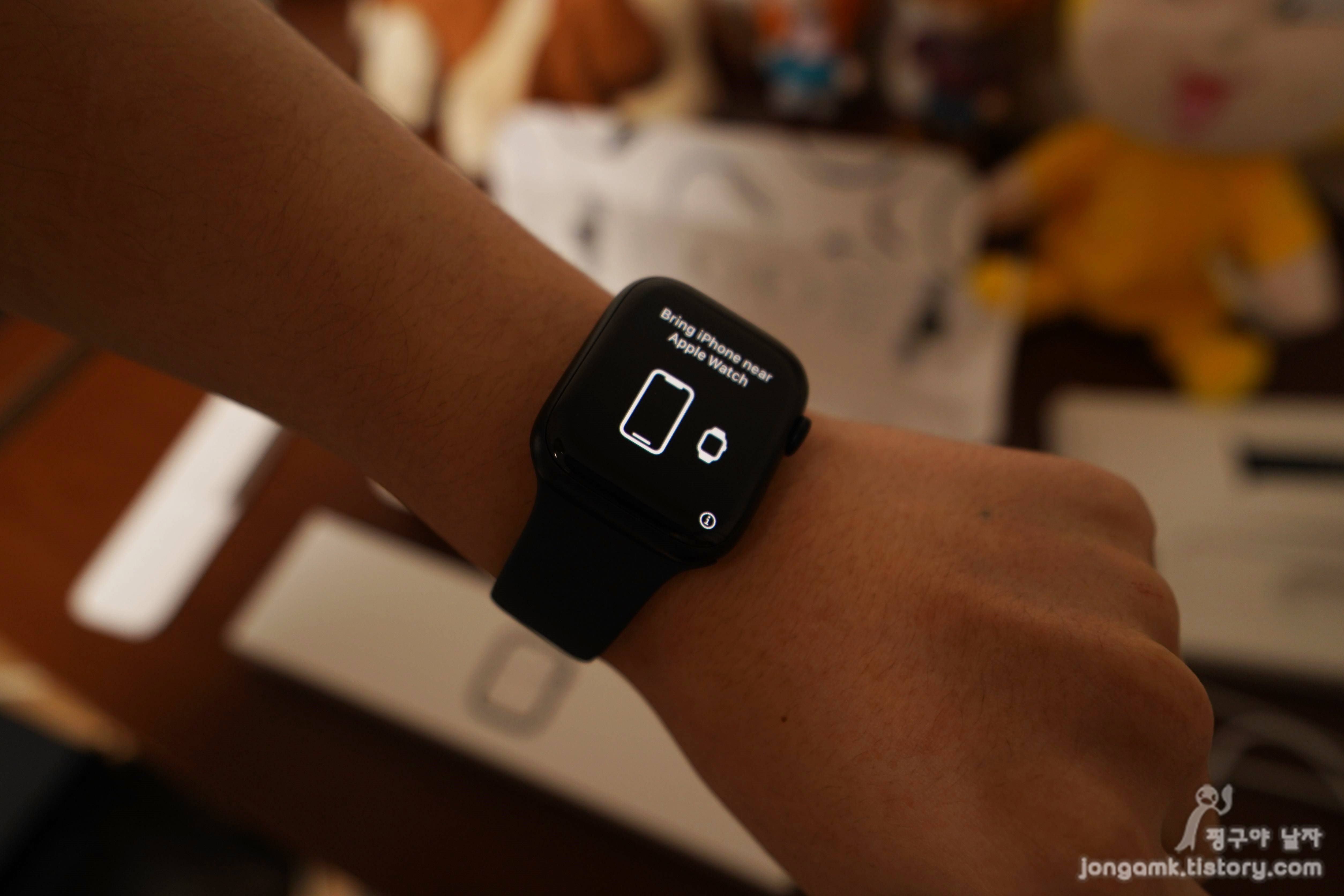 애플워치7세대는 사이드의 홈으로 스트랩을 맞춰 밀어서 끼우면 되기 때문에 탈부착이 쉬워서 마음에 들었습니다. 아이폰과 연동을 해야 할 순서입니다.