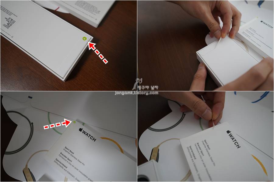 스트랩 박스와 애플워치 박스를 개봉하는 방법은 연두색 스티커를 제거하는 방법으로 스트랩은 좌측에 1개가 있고 애플워치 박스는 양사이드에 있습니다.