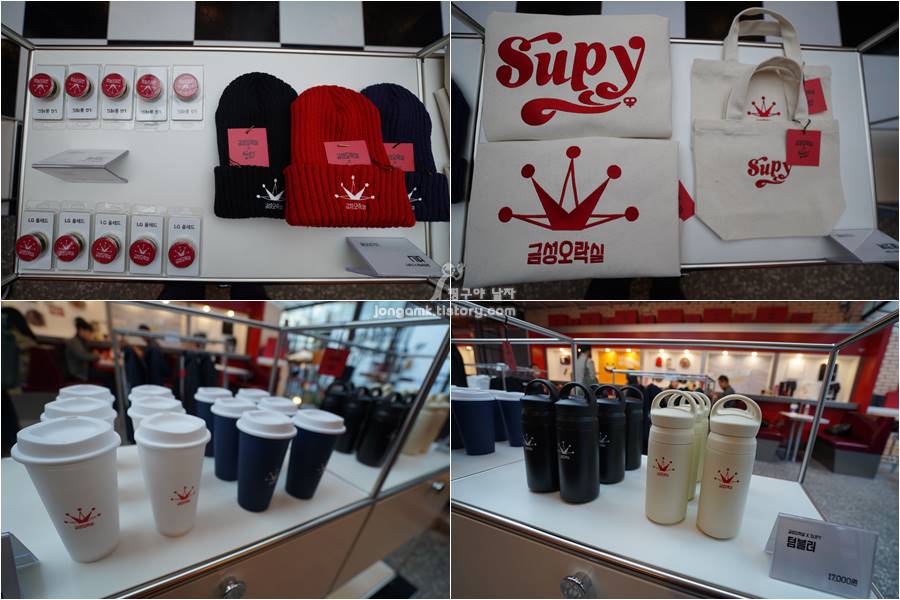 LG전자 전신인 금성사 로고가 새겨진 에코백, 머그컵, 텀블러, 그립톡, 비니, 티셔츠 등 금성오락실 전용 굿즈가 있었습니다. 가격은 플렉스 할 수 있을 정도~~