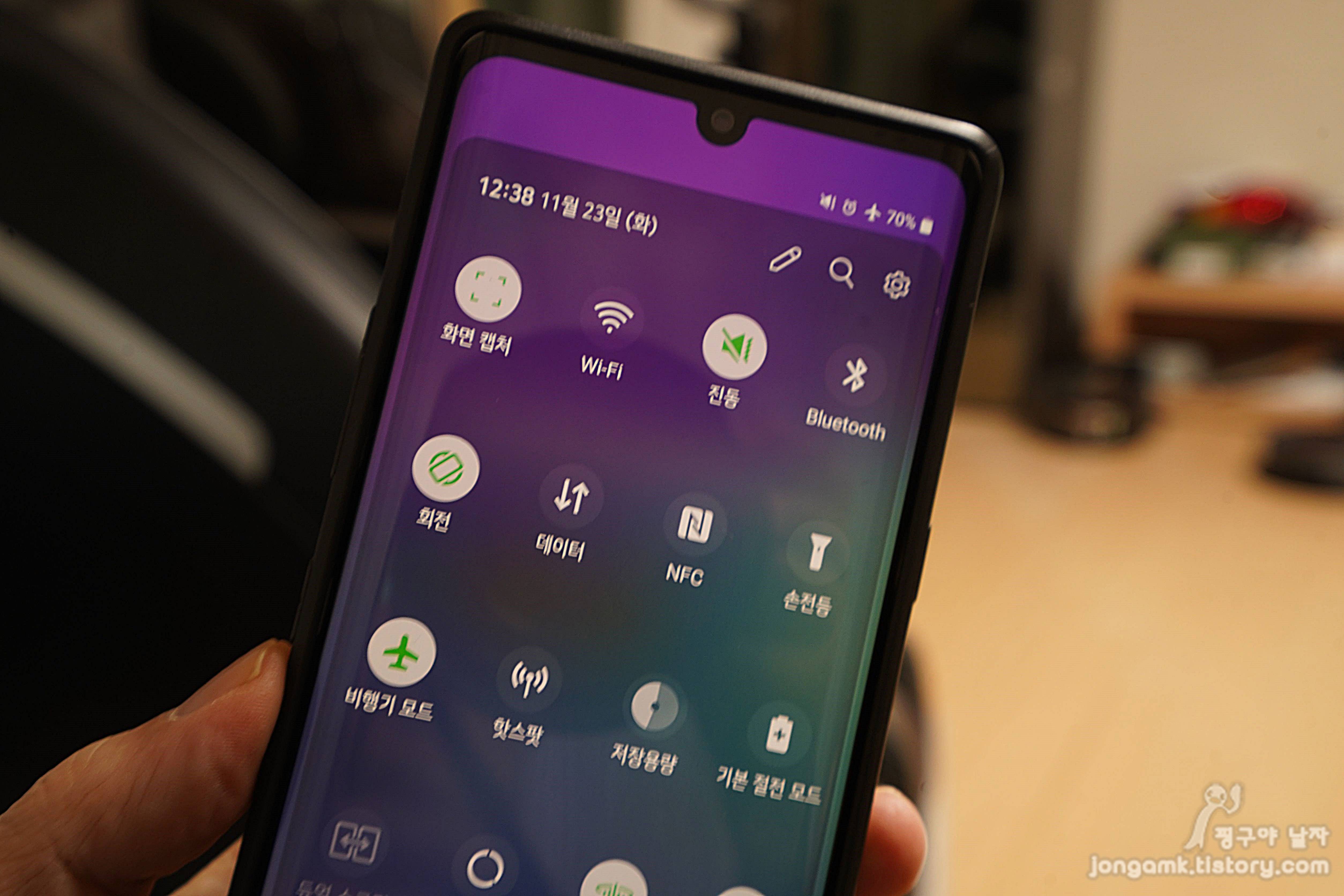 해외여행 시 기내에서 주로 사용하는 비행기모드를 사용하면 데이터, 와이파이 그리고 블루투스 기능을 자동으로 Off 시켜주면서 최소한의 전력 모소 상태를 유지합니다. 여기에 화면도 Off 시켜주면 더 좋겠죠.