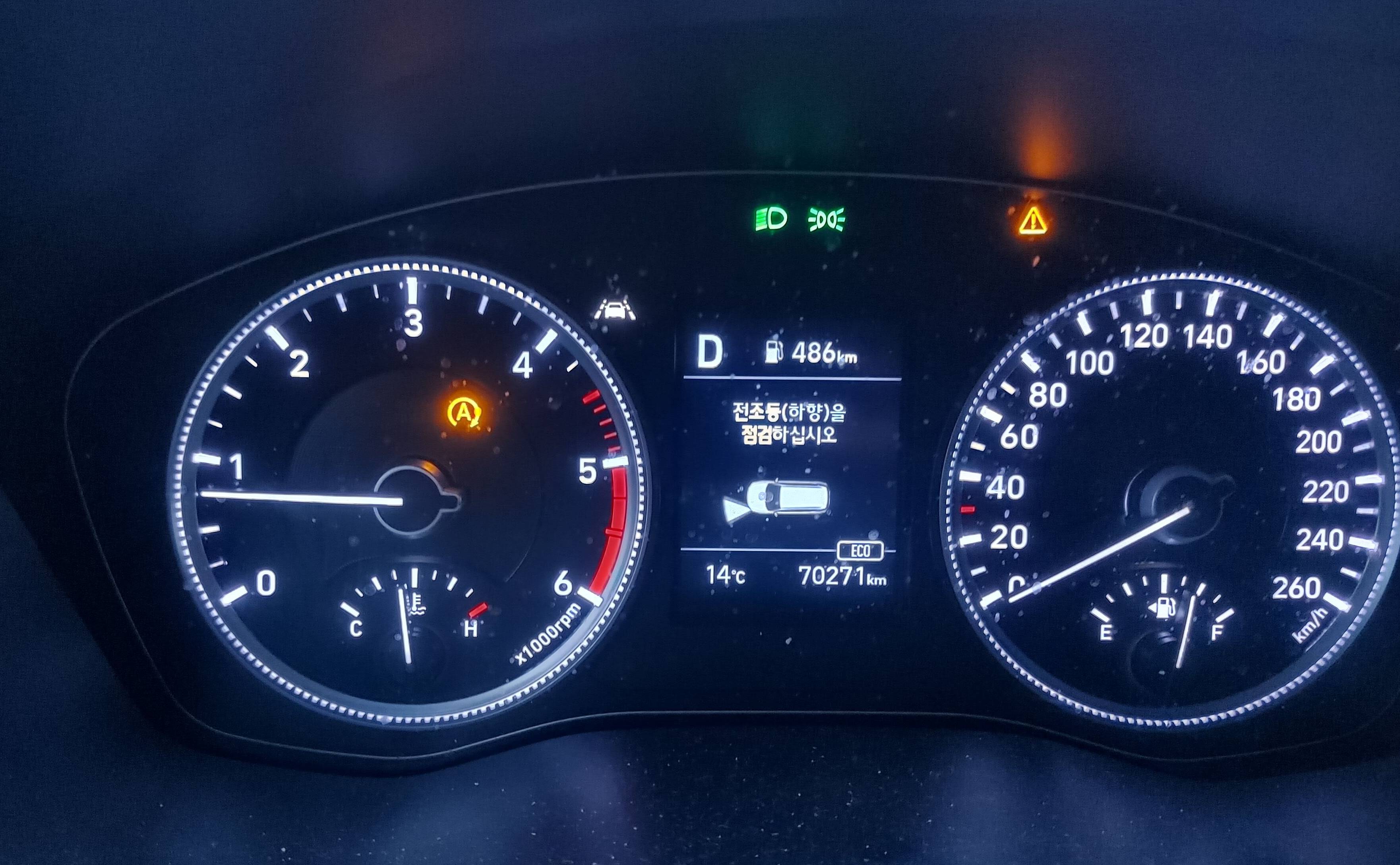 조심스럽게 운전을 하면서 주행을 하고 있는데 알림소리가 울려 살짝 놀랐답니다. 그래서 아들 보고 사진을 촬영하라고 하고 보니 전조증(하향)을 점검하십시요라고 되어 있는 거 있죠.