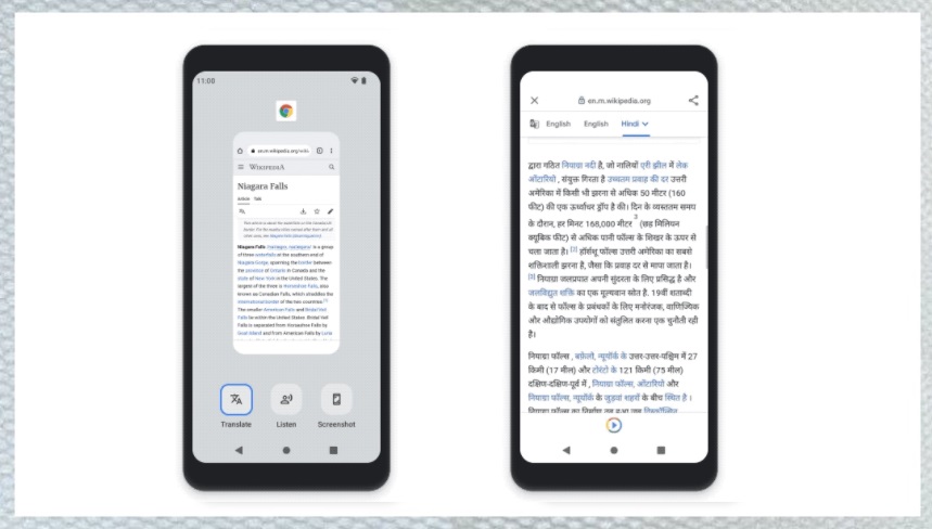 스마트폰은 앱을 자동으로 최대 절전 모드로 전환할 뿐만 아니라 앱이 의도적으로 최대 절전 모드임을 알리는 알림도 받게 됩니다. 왼쪽에 있는 안드로이드폰11 은 번역, 듣기 및 스크린샷 버튼이 있는 크롬의 위키피디아 페이지의 정지 이미지입니다. 반면 안드로이드12는 페이지의 콘텐츠가 영어에서 힌디어로 번역되는 애니메이션을 보여줍니다.