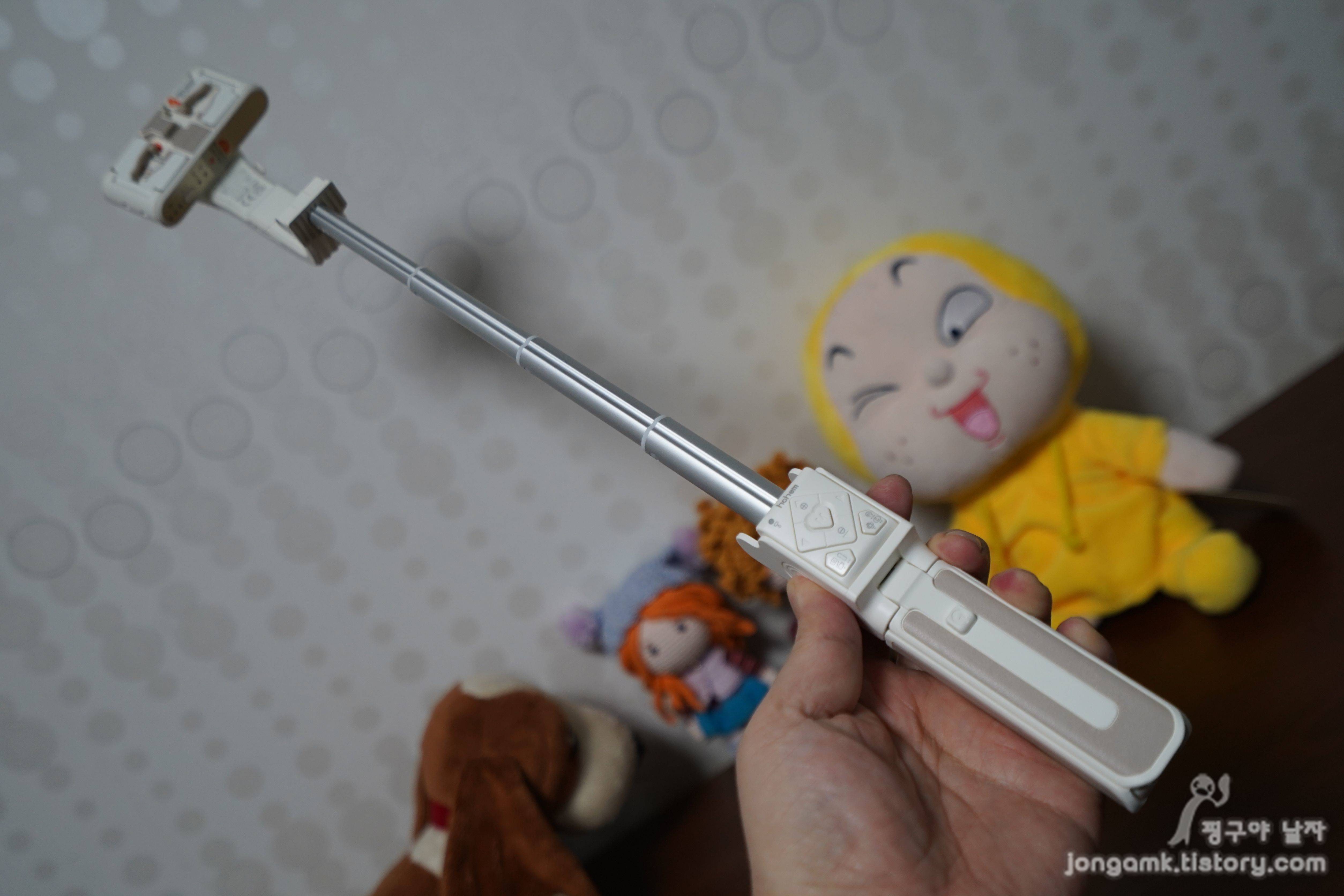 무게는 195g이라 가볍고 크기는 접었을 때 140 x 54 x 36mm이며 셀카봉으로 사용할 때 펼치면 길이는 스마트폰 하단부터 500mm이니 포함하면 더 길겠죠.