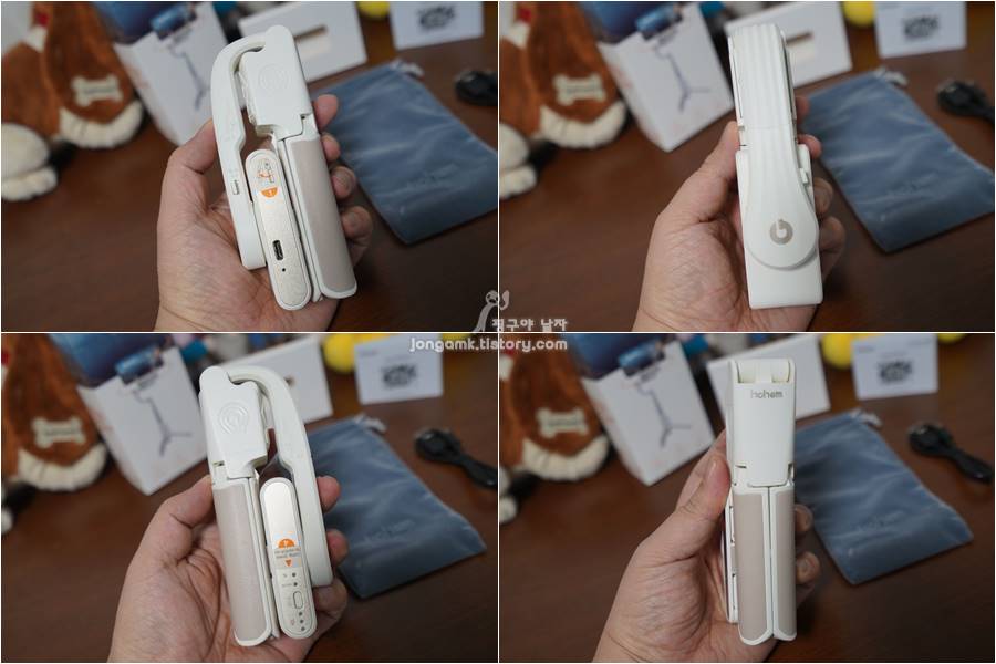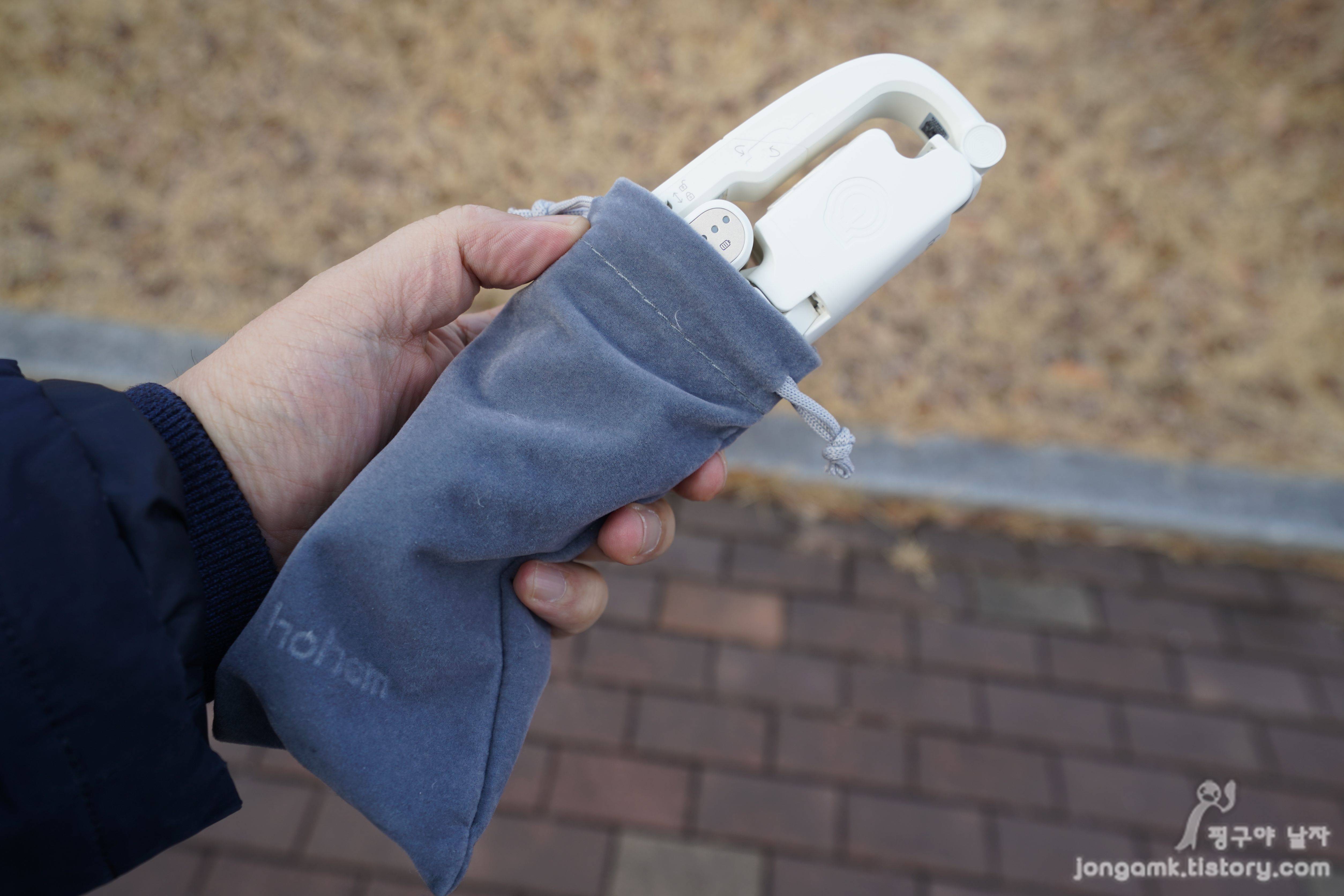 호헴 아이스테디Q의 모습입니다. 손아귀에 들어올 정도로 작고 귀엽죠. 하단은 거치대 겸 손잡이고 스마트폰을 거치하는 부분은 돌려서 펼치고 사용하지 않을 때는 원위치해서 파우치에 보관하면 됩니다.
