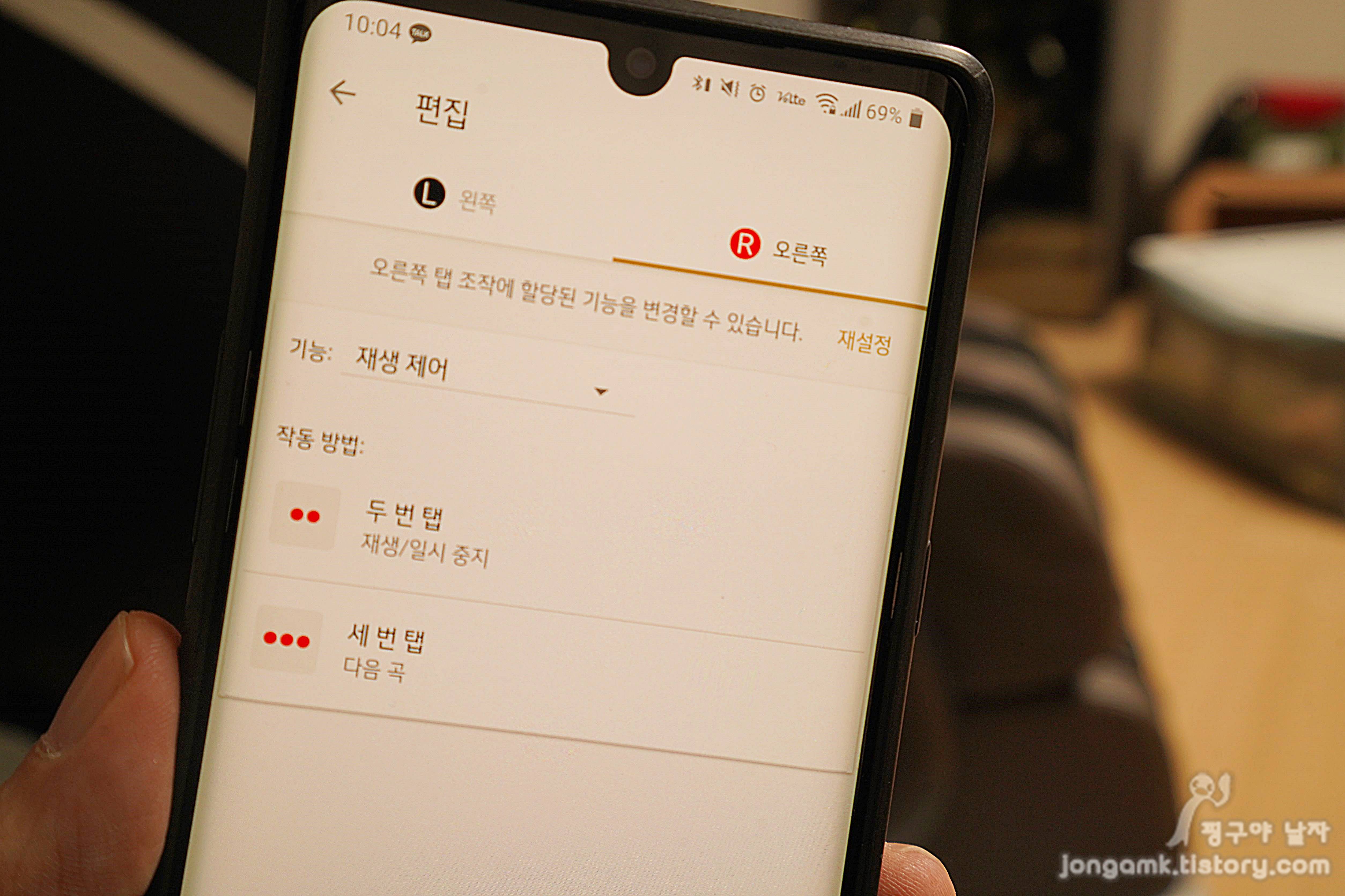 링크버즈는 무선이어폰을 탭하는 것이 아니라 귀 앞쪽을 터치하여 컨츠롤하는 탭조작 방식을 제공하기 때문이죠. 탭 구간을 좀 더 넓게 하려면 앱에서 설정하면 됩니다. 무선이어폰을 탭할 때의 습관적으로 힘을 주던 분들이 느끼는 압박은 아마 없을 듯 합니다.