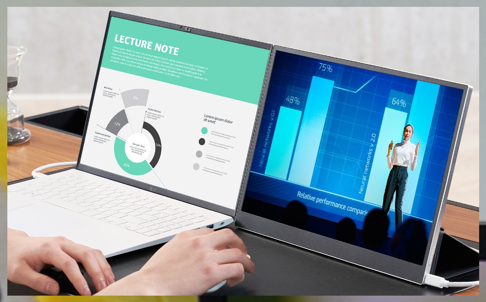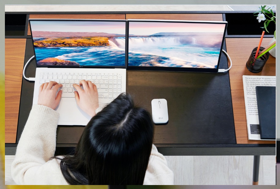 특히 듀얼모니터를 사용하는 분에게 유용한 기능이 제공되었는데 바로 사용자의 시선을 탑지하는 기능입니다. 엘지 그램 노트북에 탑재된 카메라로 사용자의 얼굴과 시선을 감지한 후 인공지능 분석을 기반으로 다양한 편의 기능을 제공하였습니다.