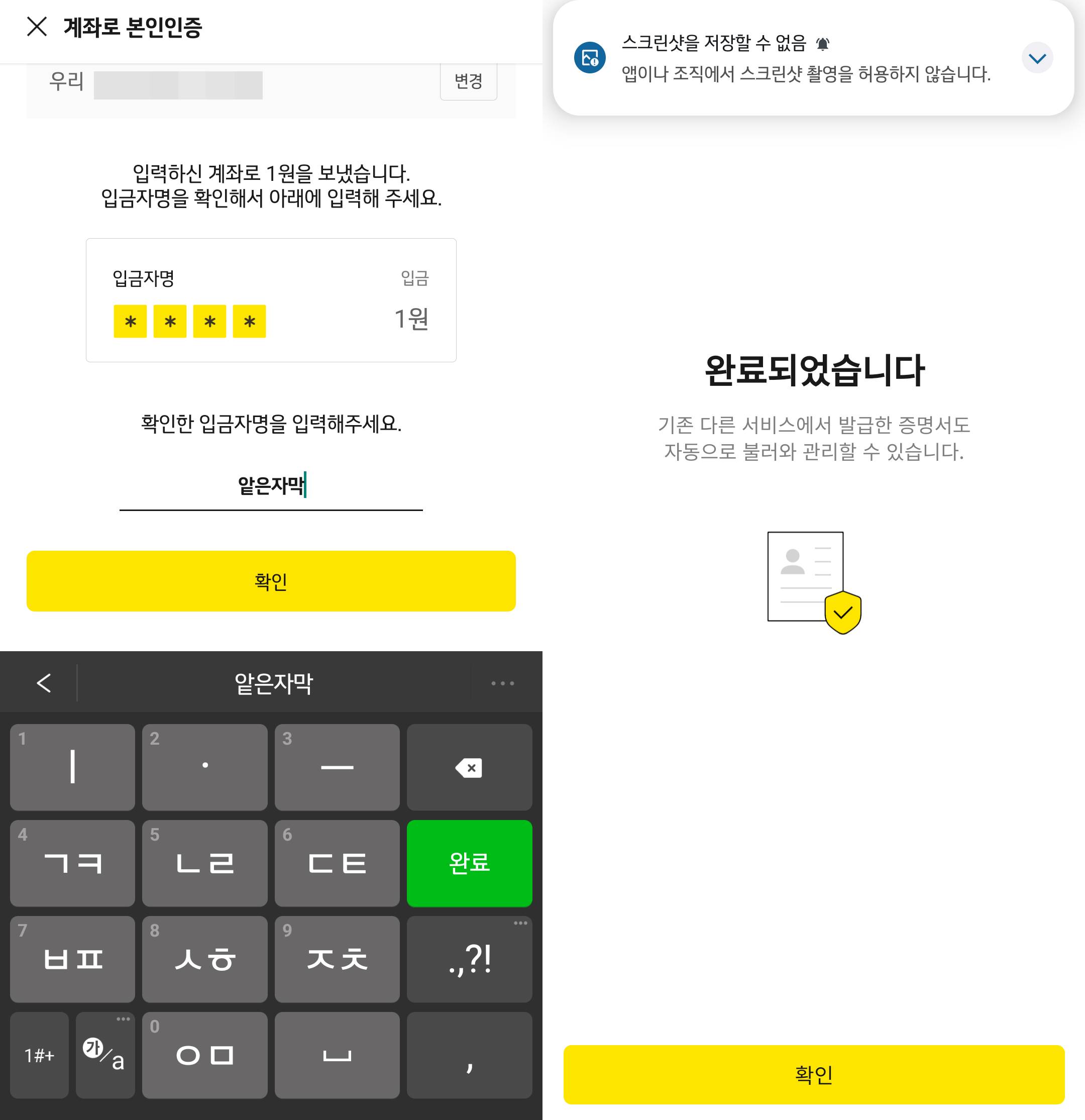 2차 인증은 통장을 통한 본인인증을 진행하게 되는데요. 선택한 개인 통장에 카카오가 1원을 입금해주며 입금자명은 랜덤입니다. 얕은자막이라는 이름으로 1원이 입금되었네요.