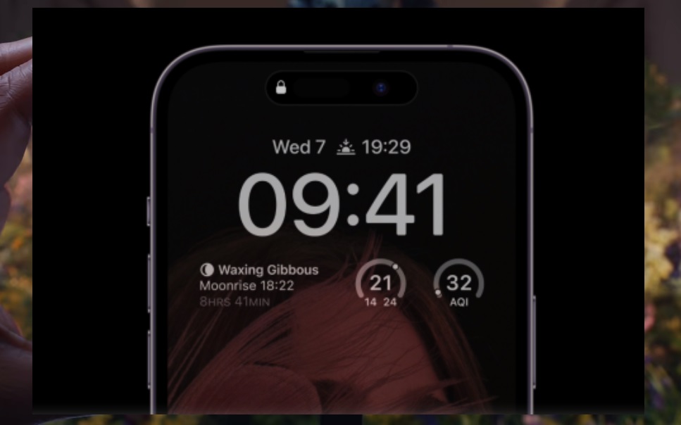 대부분의 안드로이드 기반 AOD 화면과 달리 아이폰14 프로는 배경 화면의 기본 이미지를 표시하는 미묘한 흐릿한 톤으로 기본 홈 화면 배경 화면을 표시합니다.