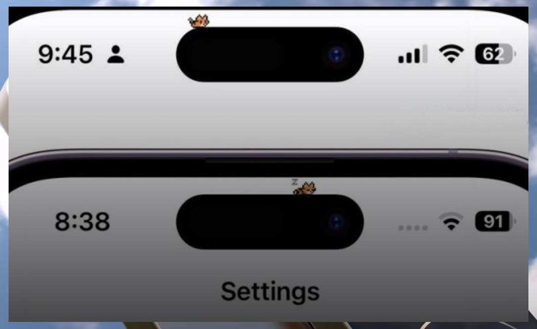일단 전면의 노치는 아이폰14의 다이나믹 아일랜드로 유지할 듯합니다. 진작에 노치를 다이나믹 아일랜드로 교체했으면 좋았을 텐데 이제라도 바뀌면서 반응이 좋습니다. 관련 앱을 설치하면 예쁜 미니 고양이가 다이나믹 아일랜드에서 보이기도 하더라구요.