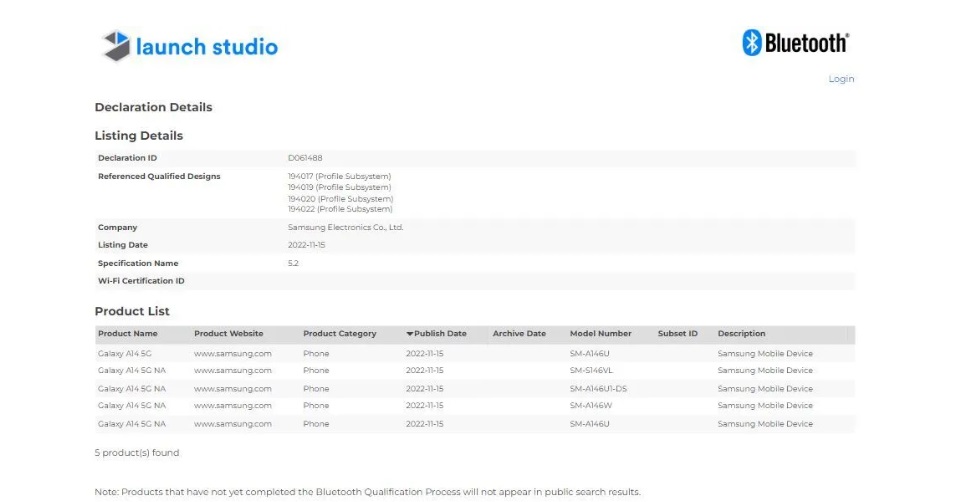 블루투스 SIG 웹사이트에 따르면 갤럭시A14 5G는 모델 번호 SM-A146U , SM-A146VL , SM-A146W , SM-A146U , SM-A146U1/DS , SM-A146P , SM-A146P/N , SM-A146P/ DSN 등이 있습니다.