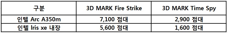 그래픽카드는 3D MARK 벤치마크 테스트 결과로 보면 삼성 갤럭시북2 프로의 인텔Arc A350M이 더 높은 점수가 나온 것으로 되어있습니다.