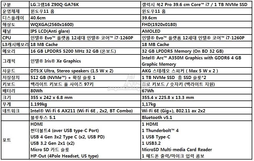 LG그램16-GA76K와 갤럭시북2 프로 스펙 비교