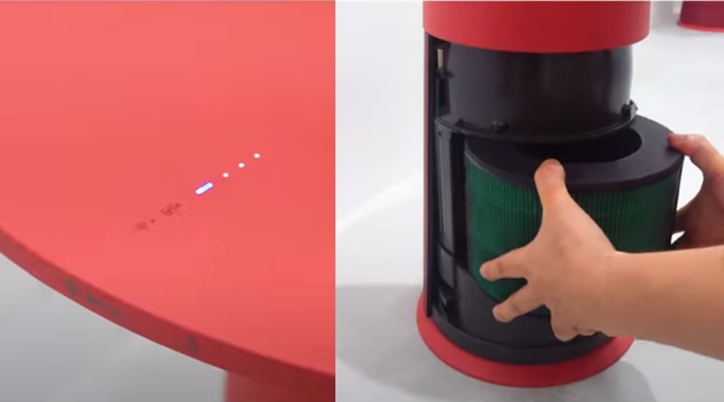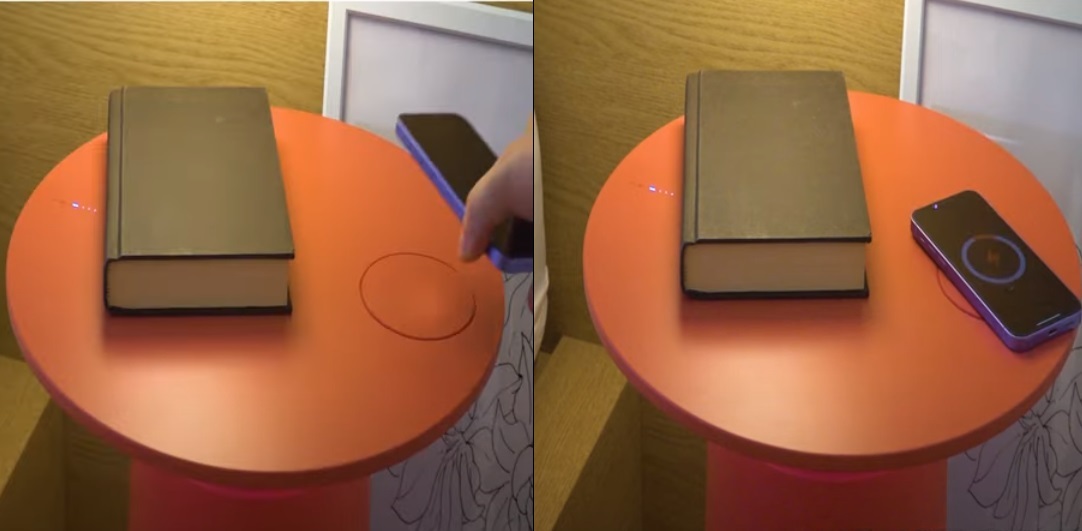공기청정기 테이블 하단에는 공간의 분위기를 바꿀 수 있는 무드 조명이 있으며, 상단에는 스마트폰이나 무선 이어폰 등을 무선 충전할 수 있게 만들었습니다. 물론 책이나 간단한 소품을 올려놓을 수도 있구요.