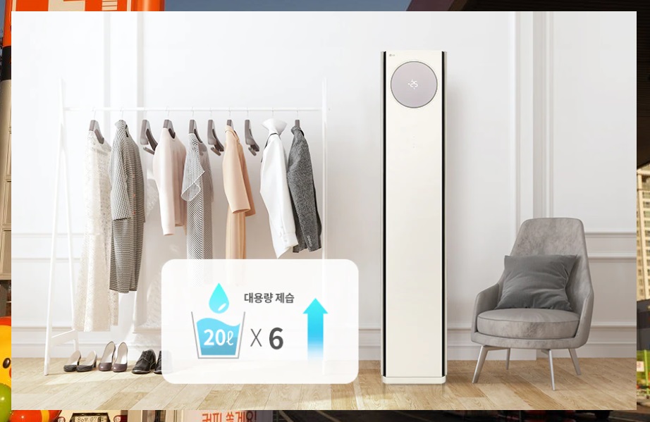 제습기 기능도 제공이 되어 장마철에 유용하게 사용할 수 있는데 20리터 용량 제습기 6대를 동시 작동시키는 것과 동일한 수준의 제습 성능을 제공합니다.