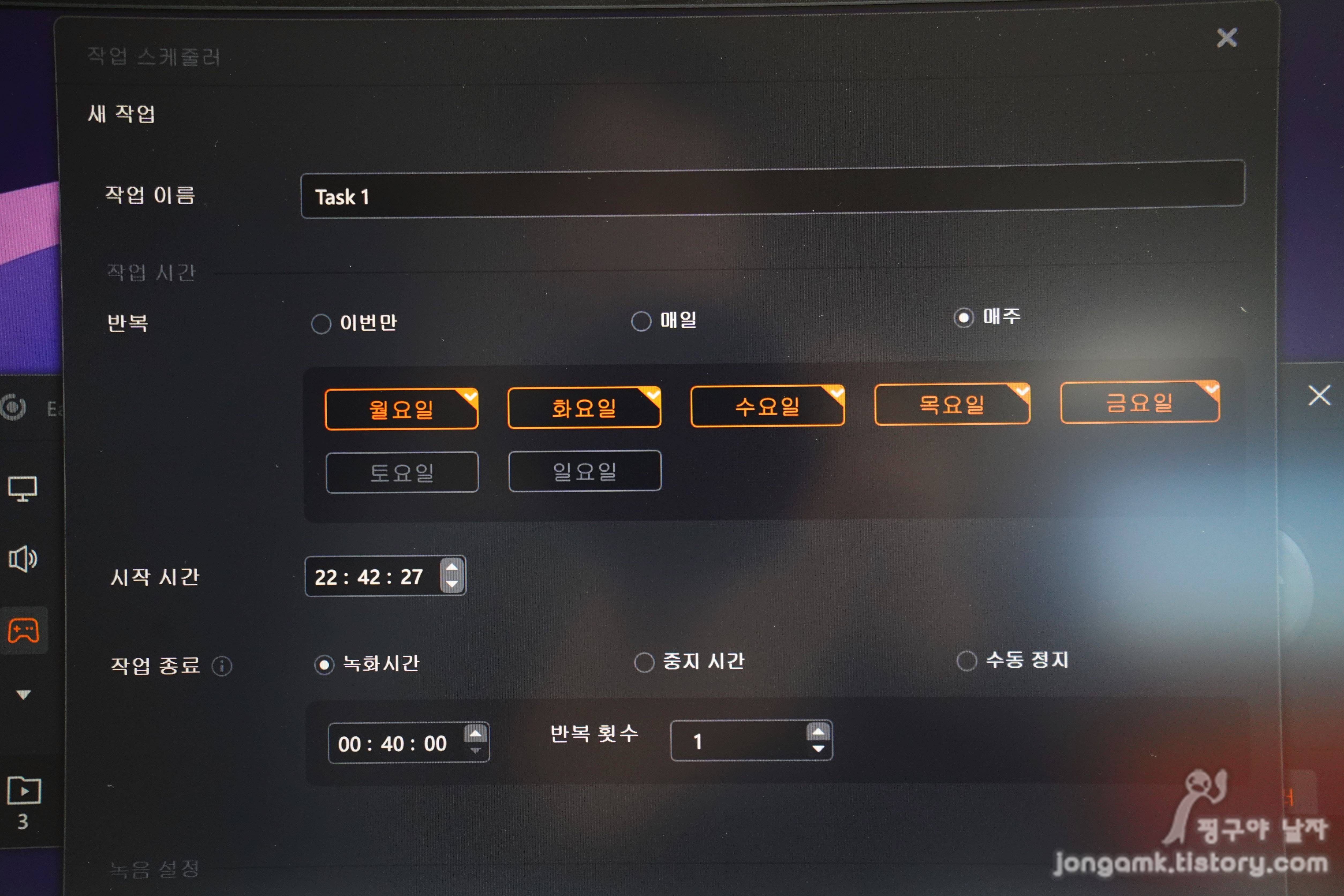 일회성으로 예약 녹화를 할 수도 있지만 매일 또는 매주 옵션을 선택하고 예약 녹화시간을 설정하면 좀 더 쉽게 원하는 동영상을 얻을 수 있어요.