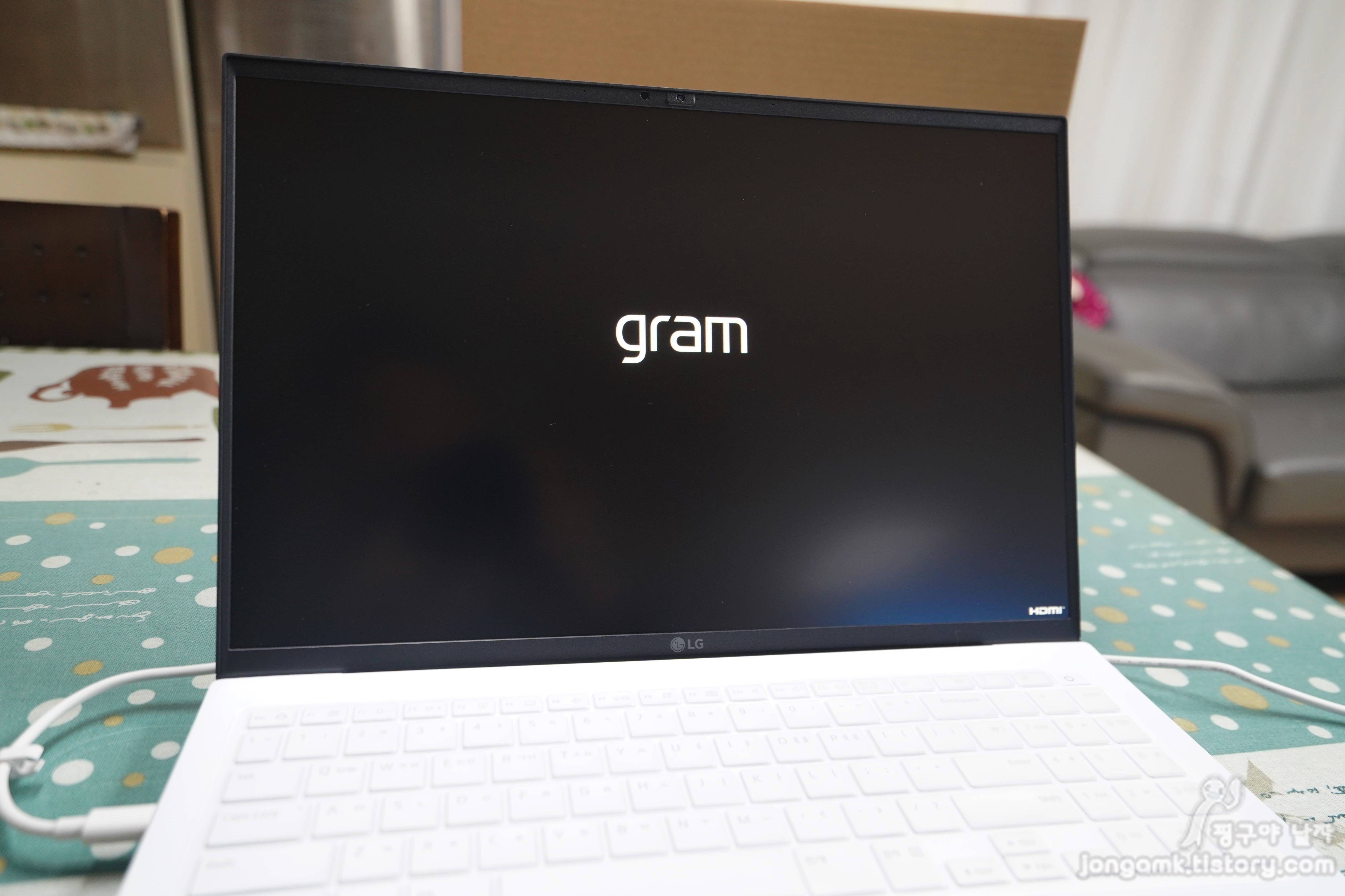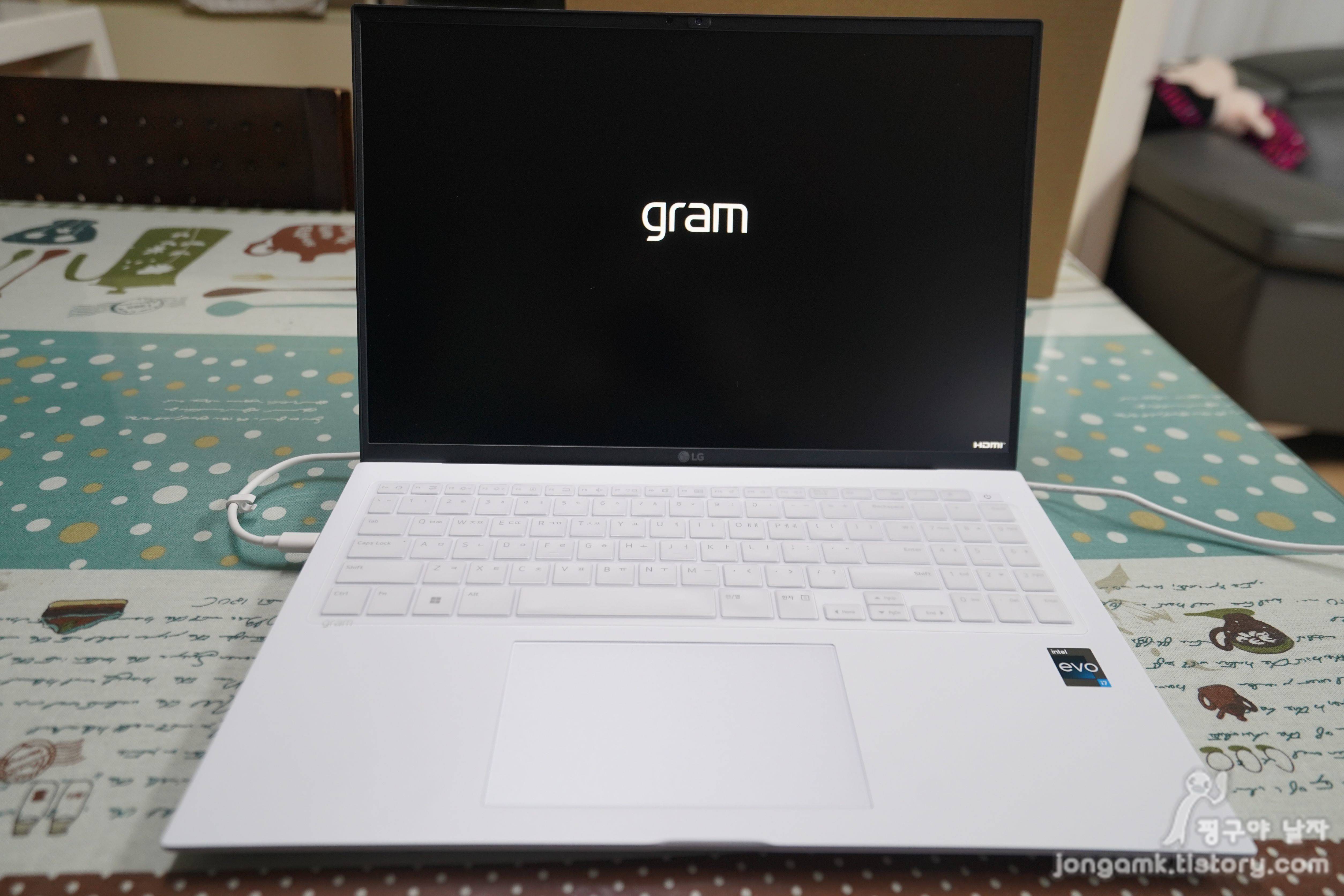 전원이 공급되면서 16인치 화면에 gram 로고가 뙇~~ 반갑네요. 저렴하게 구매하려면 NOS제품을 선택해도 되지만 게을러서 세팅하는 데 또 여러날 걸리기 때문에 윈도우11을 탑재한 모델로 결정하길 잘했죠.