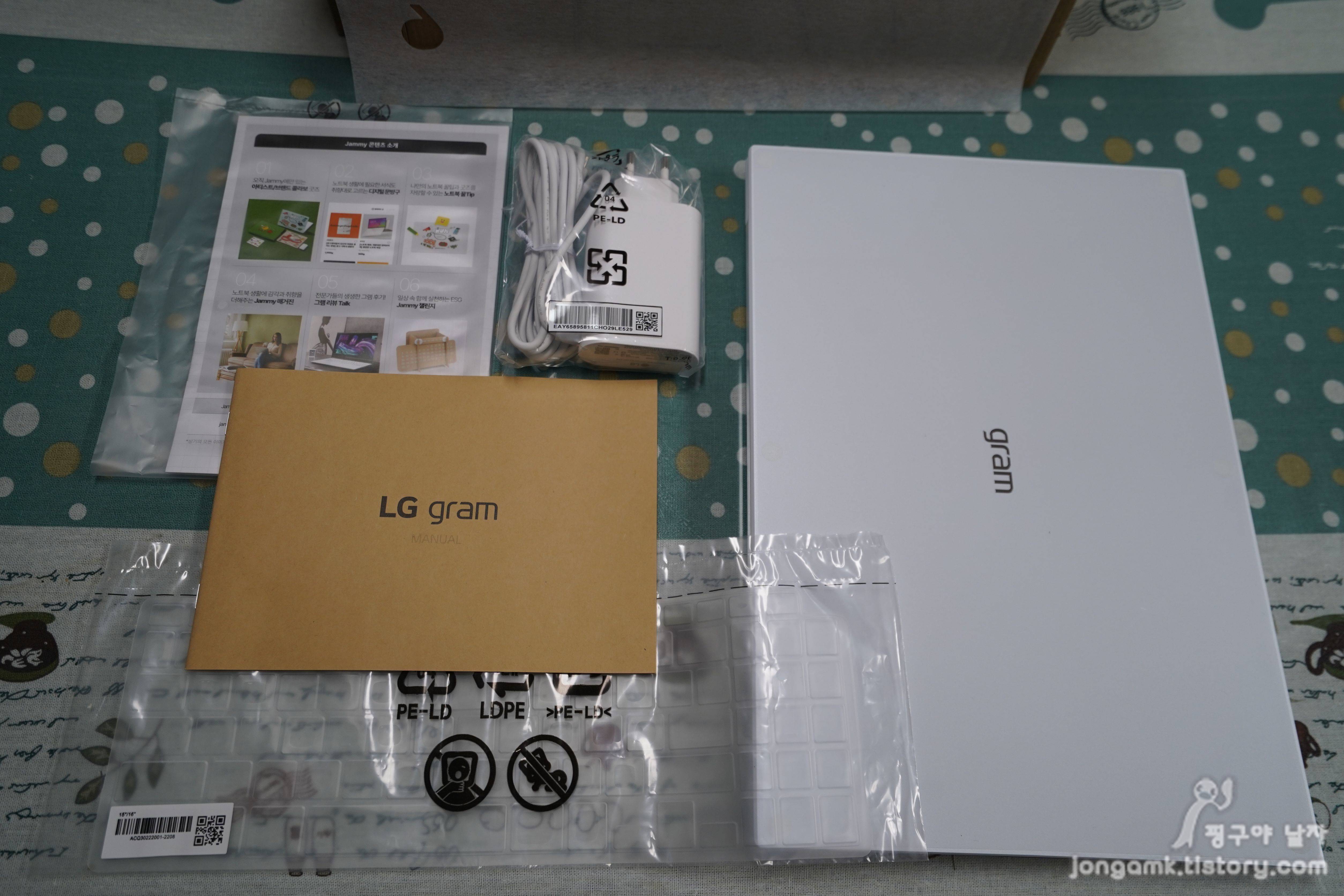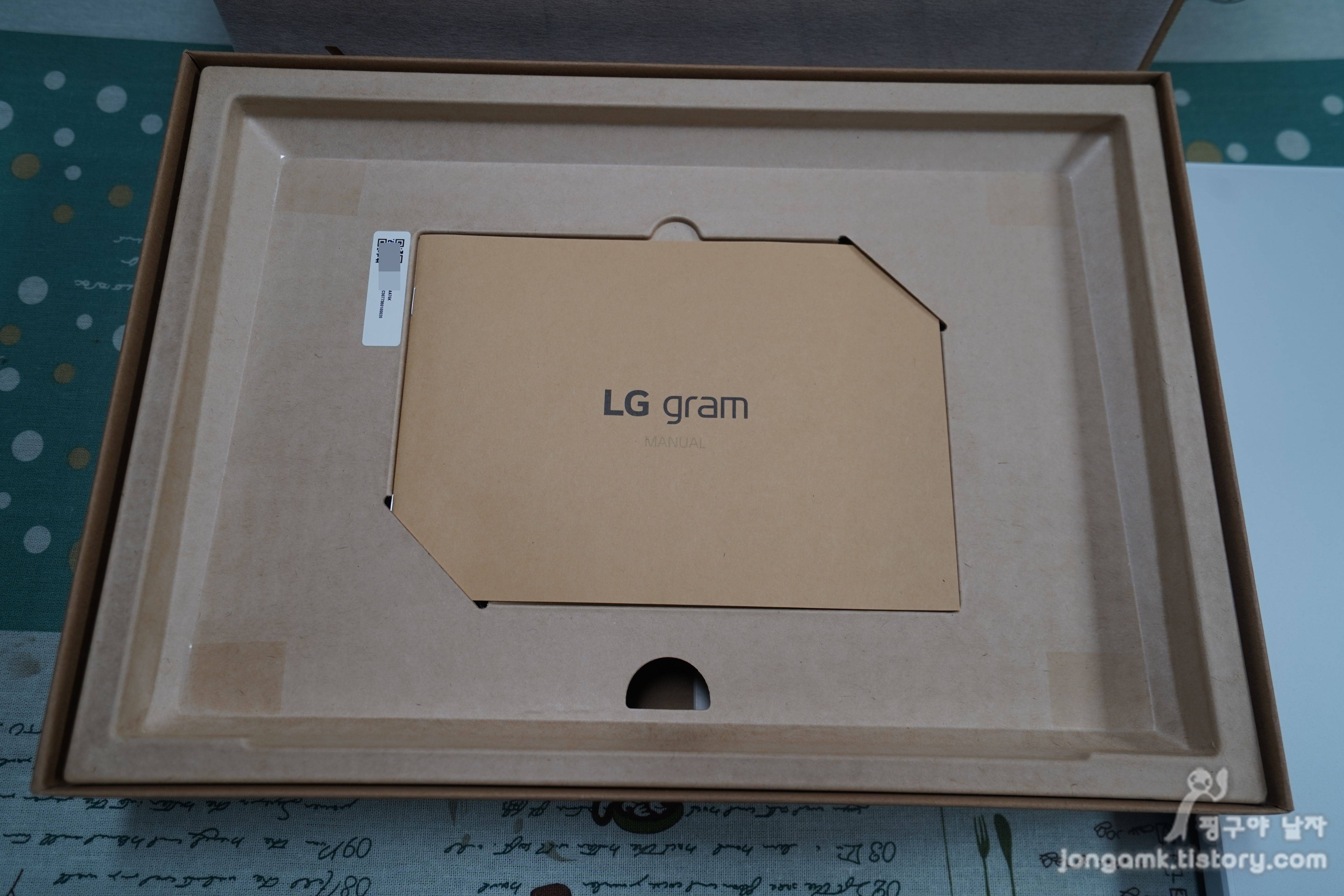 바로 아래에는 LG gram의 상품소개서가 보입니다. 그리고 바로 아래에는 충전기 세트가 있습니다. 그럼 언박싱 행사는 모두 끝이 납니다. 맥북처럼 개봉하는 순간마다 설레임이 덜 하기는 하지만 ㅋㅋ