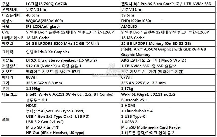 LG그램16 12세대 16Z90Q-GA76와 삼성 갤럭시북2 프로의 스펙을 간단하게 비교해 보았으니 참고하시면 될 것 같아요. 다시보니 살짝 고민했던 게 떠오르네요. ㅋㅋ