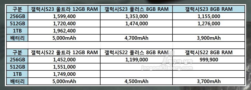 갤럭시S22 울트라와 갤럭시S23 울트라 가격과 종류?