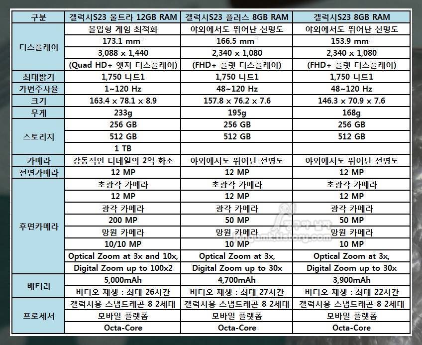 삼성 갤럭시S24 울트라의 정확한 스펙을 알기 위해서는 좀 더 시간이 필요하겠지만 대략 갤럭시S23 시리즈의 스펙과 비슷하지 않을까 생각됩니다.