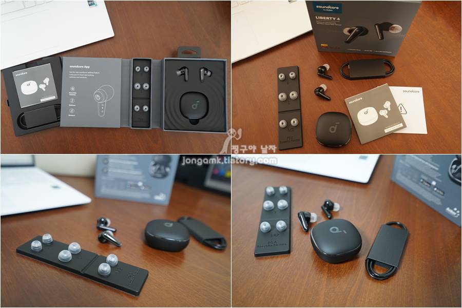사운드코어 리버티4 구성품은 무선이어폰, 충전기 및 C type 충전케이블, 여분의 이어팁 대, 중, 소 그리고 사용설명서로 되어 있습니다. 이어팁과 충전 케이블도 깔끔하게 수납이 되어 있어 괜찮았어요.